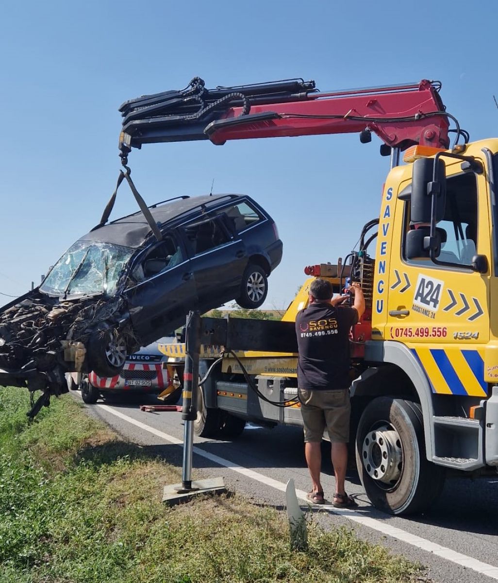 Mașina a fost repusă pe roți și preluată de o platformă SOS Savencu.