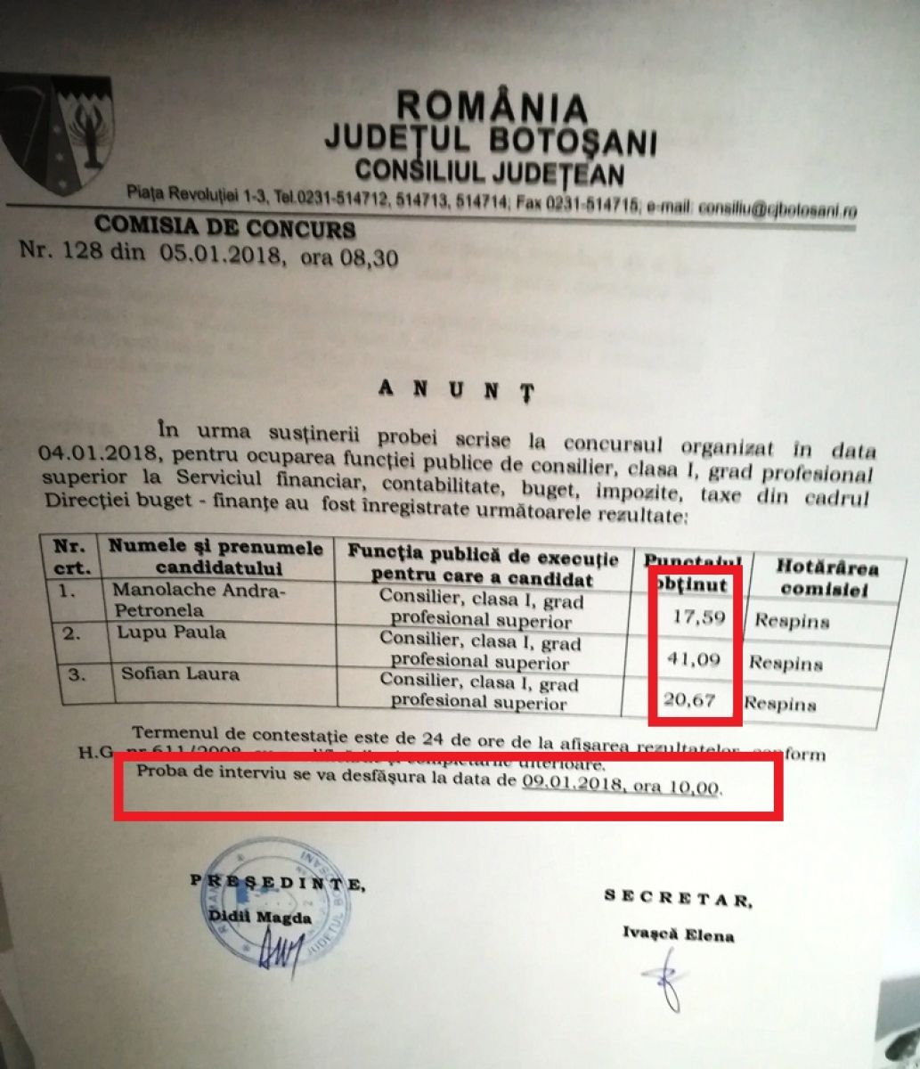 Deși toate trei au fost atunci eliminate, pe anunțul prin care se făceau publice rezultatele, se preciza că, ”proba de interviu se va desfășura la data de 09.01.2018, ora 10:00”.