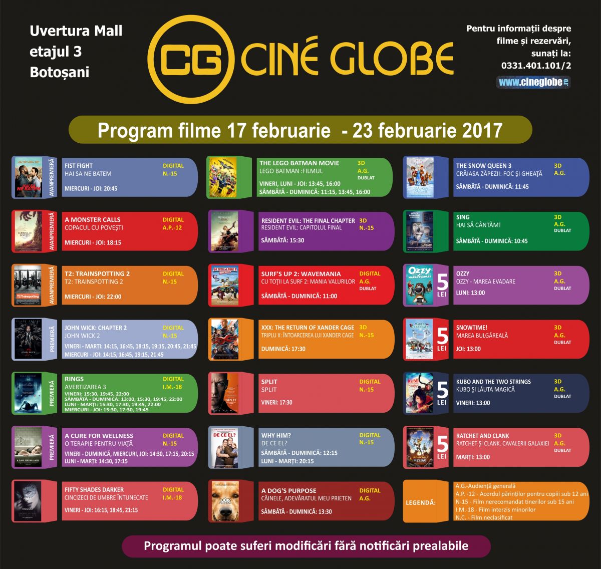 Iubitorii de film din Botoşani pot petrece momente plăcute în perioada 17 – 23 februarie la Cine Globe din incinta Uvertura Mall cu noi pelicule care vor fi proiectate în avanpremieră.