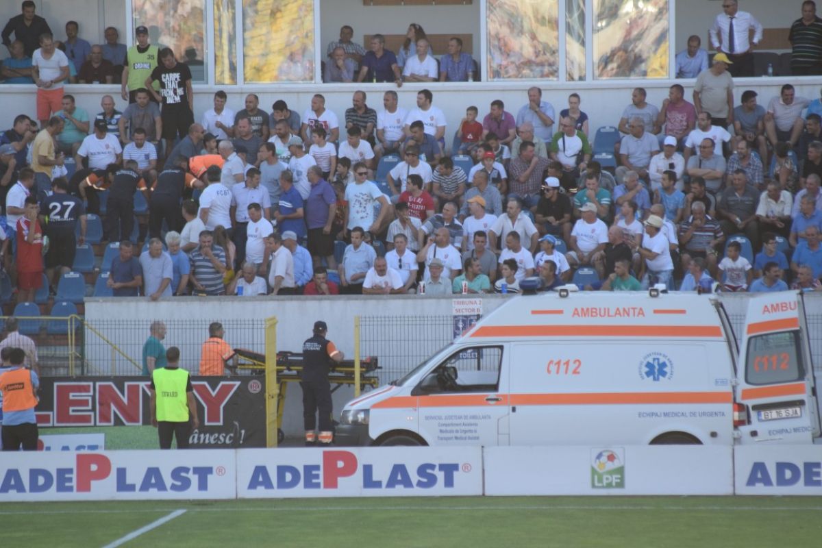 Ambulanța a ajuns până în zona în care se afla bărbatul. Acesta era inconștient. Mai mulți salariați ai Serviciului Județean de Ambulanță (SJA) l-au pus pe o targă și l-au cărat la ambulanță. Autosanitara a mai petrecut câteva minute la marginea terenului după care, centralul a oprit meciul pentru a putea părăsi arena.