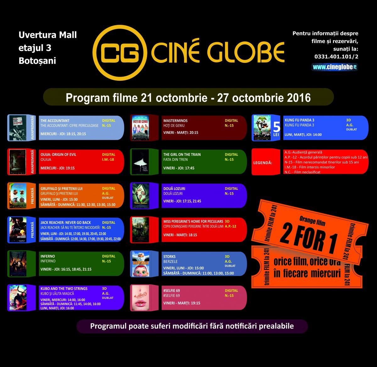 Reprezentanții Cine Globe au pregătit în perioada 21 - 27 octombrie 2016,două avanpremieră și două premiere pe marile ecrane ale multiplexului din incinta Uvertura Mall.