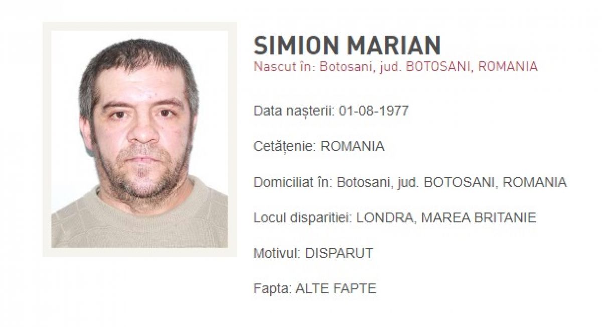 Simion Marian, născut pe 1 august 1977 și domiciliat în Botoșani, a plecat la muncă în Anglia, mai exact în Londra, în luna iulie a anului 2022, scrie pe site-ul Poliției Române, la secțiunea Persoane dispărute.
