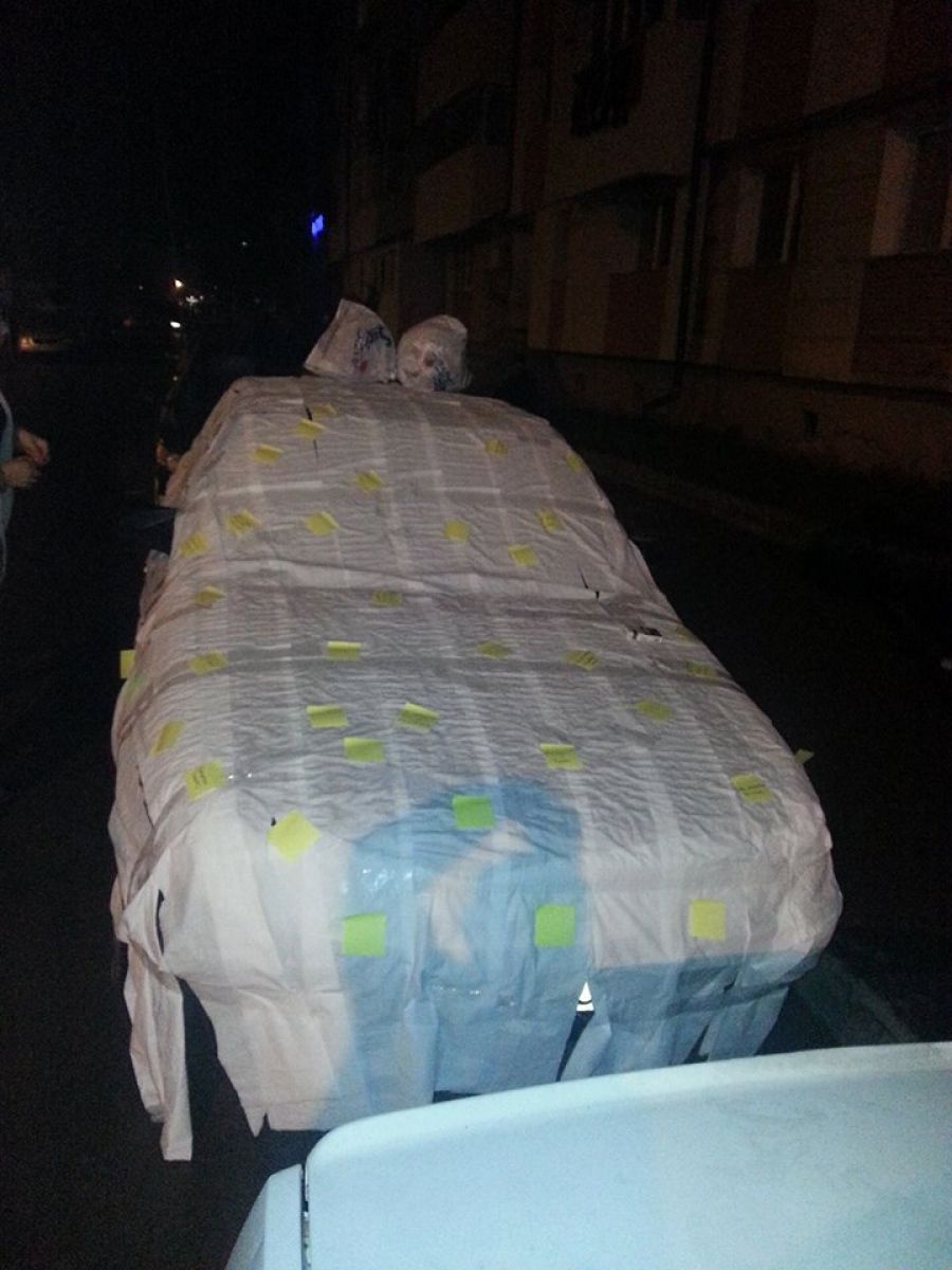 Amicii sărbătoritului puși pe șotii, i-au pregătit o farsă care cu siguranță nu o va uita niciodată. Pentru a pune planul la cale, protagoniștii au cumpărat mai multe suluri de hârtie igienică, câteva post-it-uri pe care au scris diverse mesaje, una bucată mașină și… s-au apucat de treabă. Cu scopul de a-i face ziua de neuitat, prietenii botoșăneanului i-au ”îmbrăcat” automobilul în hârtie. Momentul în care proprietarul și-a văzut mașina cu o ”vestimentație” nouă, a fost unul cât se poate de haios. (Ș.V.)