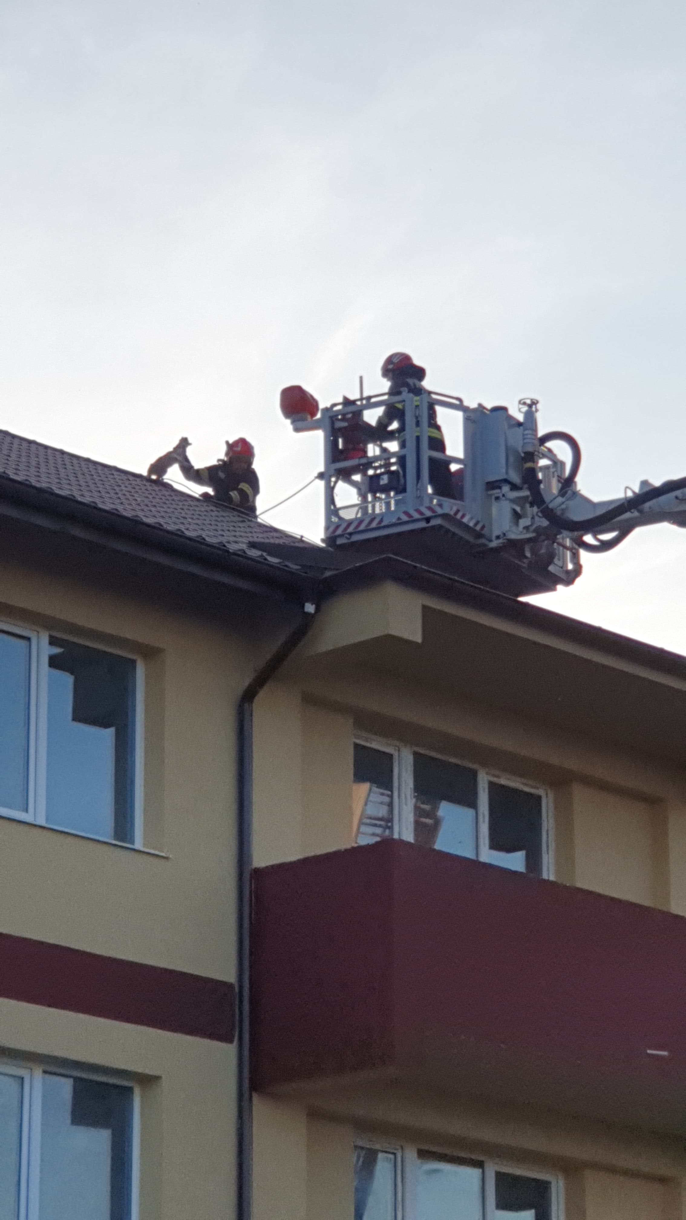 În această seară, misterul s-a risipit: o femeie a observat pisica pe acoperișul unui bloc aflat în construcție. Pentru că nu o putea coborî singură, a cerut sprijinul pompierilor.