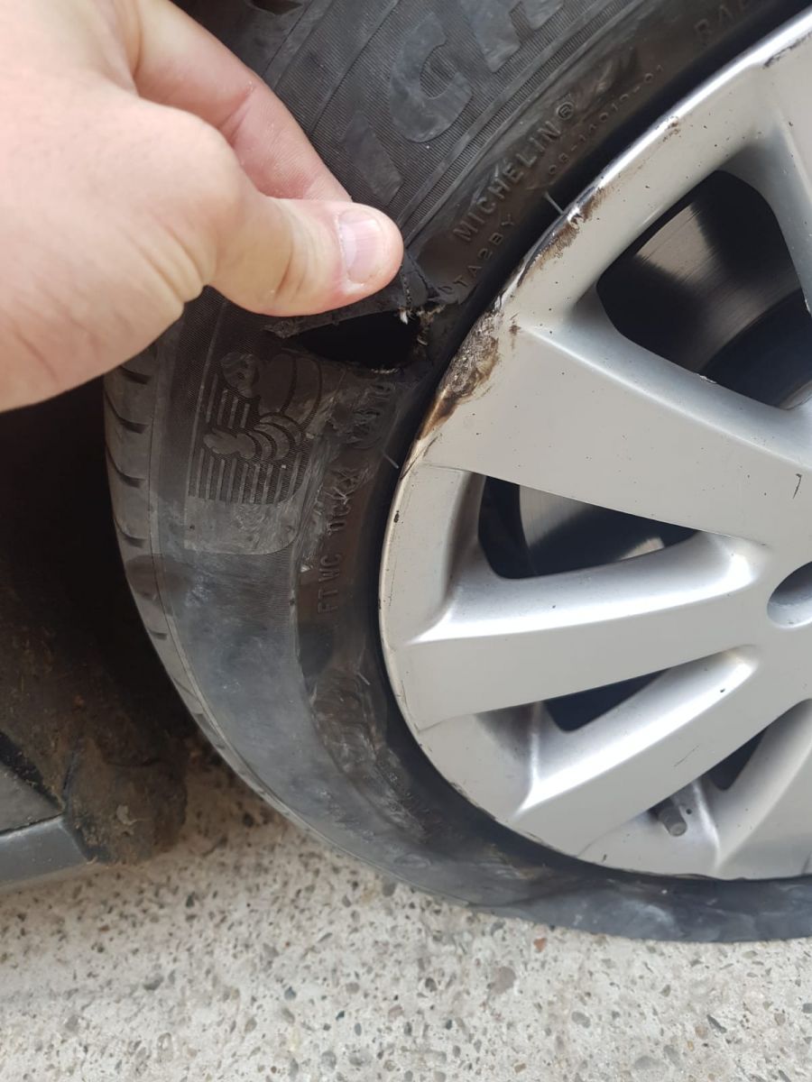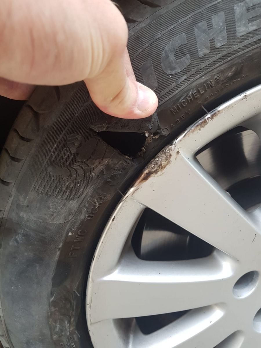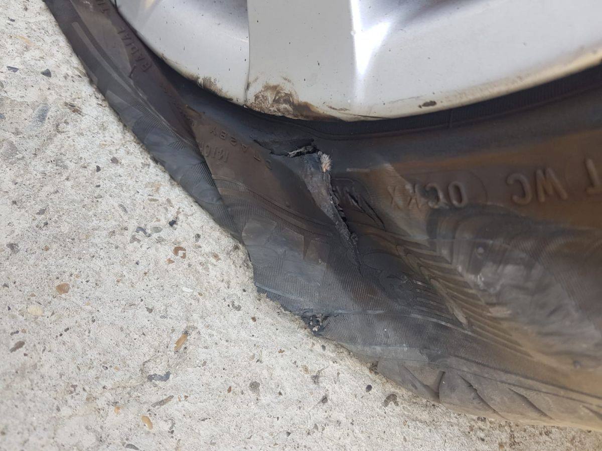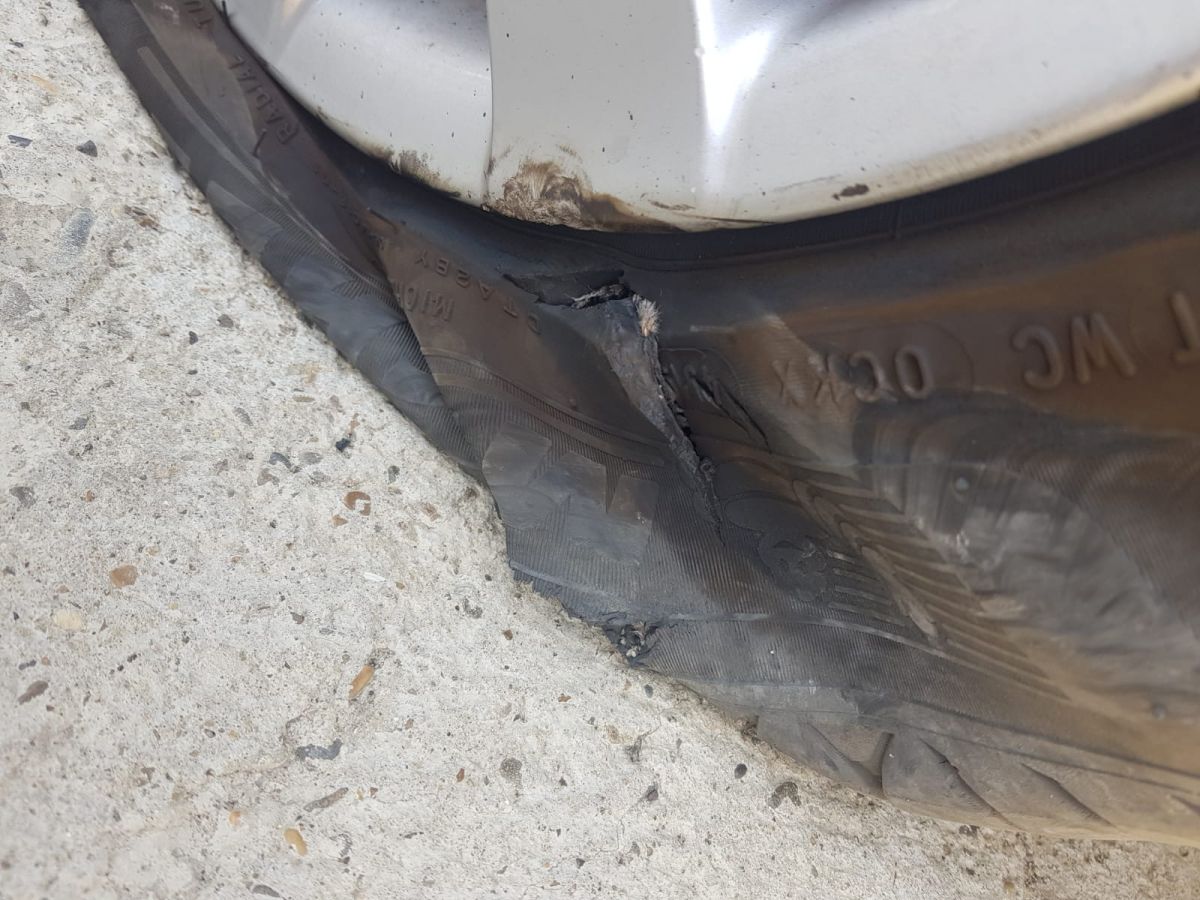 A intrat într-o groapă și și-a tăiat două anvelope fiind nevoit să le arunce și să cumpere altele noi, întrucât cele vechi nu au mai putut fi reparate.
