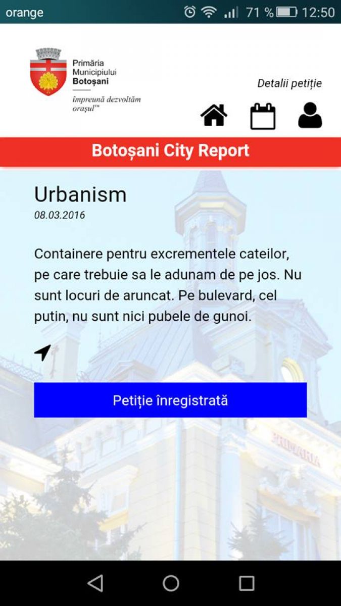 Un botoșănean, cel mai probabil nemulțumit să vadă fecale de animale la tot pasul, cere Primăriei municipiului Botoșani să amplaseze mai multe containere, acolo unde să fie puse excrementele patrupedelor. ”Containere pentru excrementele cățeilor pe care trebuie să le adunăm de pe jos. Nu sunt locuri de aruncat. Pe bulevard cel puțin nu sunt pubele de gunoi”, este mesajul înregistrat pe aplicație.