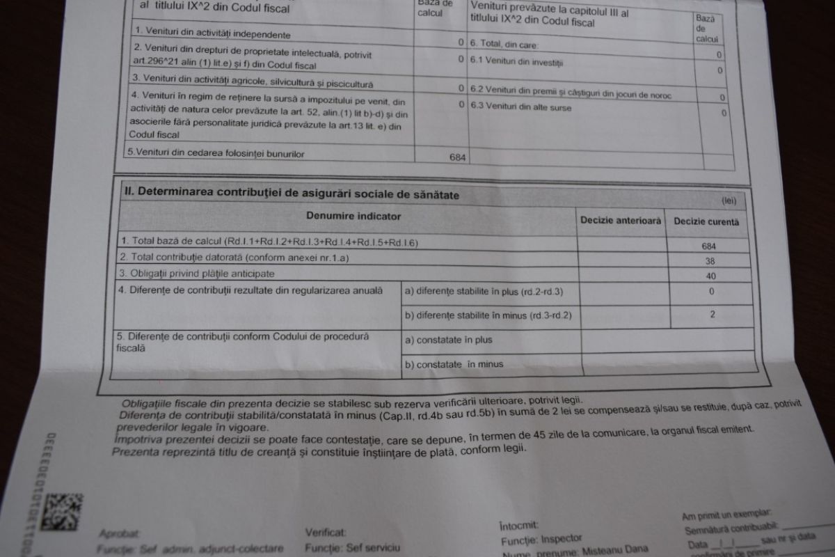 „În momentul în care primești plicuri de la Poliție, de la ANAF, te stresezi. Ce am făcut? Ce Dumnezeu? Timp pierdut, drumul până acolo. Când am ajuns acolo, dacă tot m-ați chemat pentru 2 lei, dați-mi-i. Păi stați, că banii nu-s veniți, dvs. faceți o cerere ca să vă virăm cei 2 lei. Și m-au mai trimis o dată, când eram la Săveni, să plătesc 1 leu, atunci l-au luat imediat”.