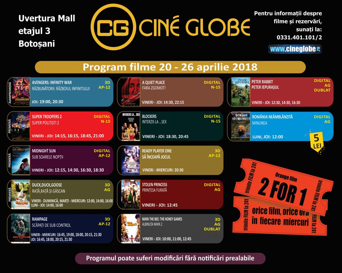 Dintre toate filmele săptămânii, se face remarcat blockbuster-ul “Avengers: Infinity war”, cel mai așteptat film al acestei primăveri care abia își așteaptă fanii seriei Marvel la cinema. De asemenea, documentarul românesc ”România neîmblânzită” ajunge și el la Botoșani și poate fi vizionat la un preț special, de doar 5 lei.