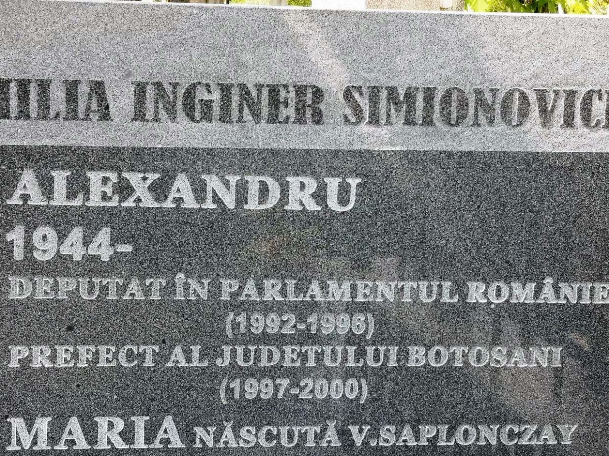 Alături de ”Familia inginer Simionovici” pe piatra funerară s-a scris: ”deputat în Parlamentul României” și ”prefect al județului Botoșani”.