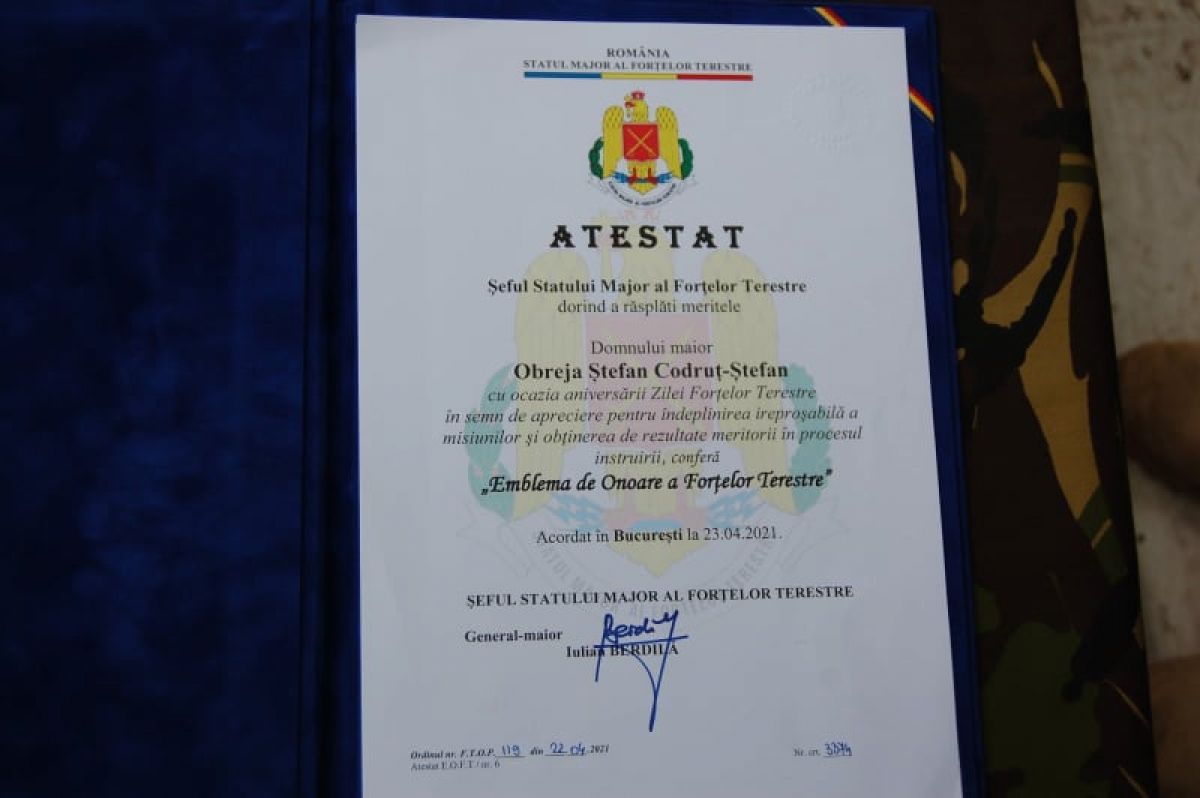 Cuvintele de laudă ale generalului au fost adresate în cinstea locotenent-colonelului Codruț Obreja, pe care superiorul l-a prezentat ca pe un exemplu demn de urmat atât profesional, cât și personal.