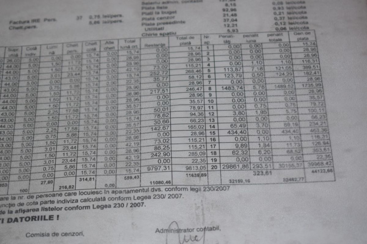 Chiriașul adunase datorii de 4.324 de lei la Nova Apaserv și aproape 400 de milioane de lei vechi la asociație. La Locativa ultimele plăți au fost efectuate în 2014, august, septembrie, octombrie, la o chirie lunară de 235,19 lei pentru un apartament cu trei camere, datoria fiind de peste 3.000 de lei.