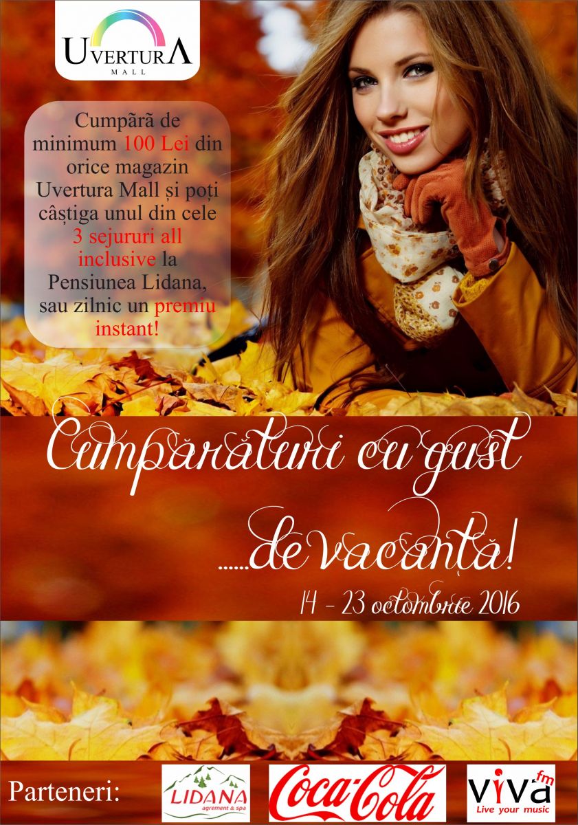 Brandurile din Uvertura Mall au trecut la colecțiile de toamnă –iarnă și îi îndeamnă pe pasionații de fashion să vină să-și completeze ținutele cu cele mai noi articole din tendințe, alegând din paleta cromatică a sezonului. Cei mai fideli cumpărători, care vor cumula 100 lei din magazinele Centrului Comercial în perioada 14-23 octombrie, vor fi premiați zilnic cu surprize instant și vor avea șansa de a admira irezistibilele peisaje de toamnă în unul din cele 3 sejururi all inclusive la Complexul Turistic Lidana.