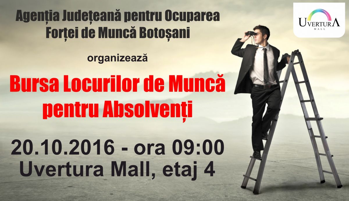 Joi, 20 octombrie, tinerii absolvenți au ocazia să își găsească un loc de muncă din oferta variată a angajatorilor prezenți la Bursa Locurilor de Muncă pentru Absolvenții promoției 2016 organizată de Agenția Județeană pentru Ocuparea Forței de Muncă, Botoșani. Cei interesați se pot prezenta cu un curriculum vitae, la etajul 4 din Uvertura Mall, începând cu orele 9:00 pentru a interacționa cu reprezentanții companiilor prezente.