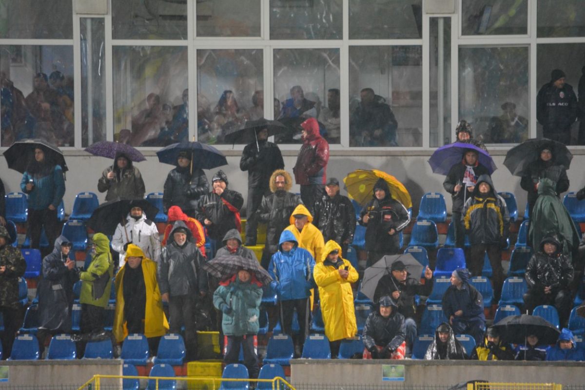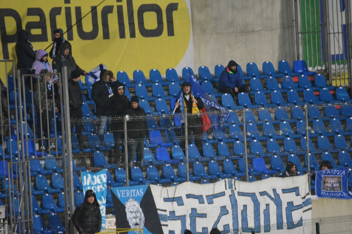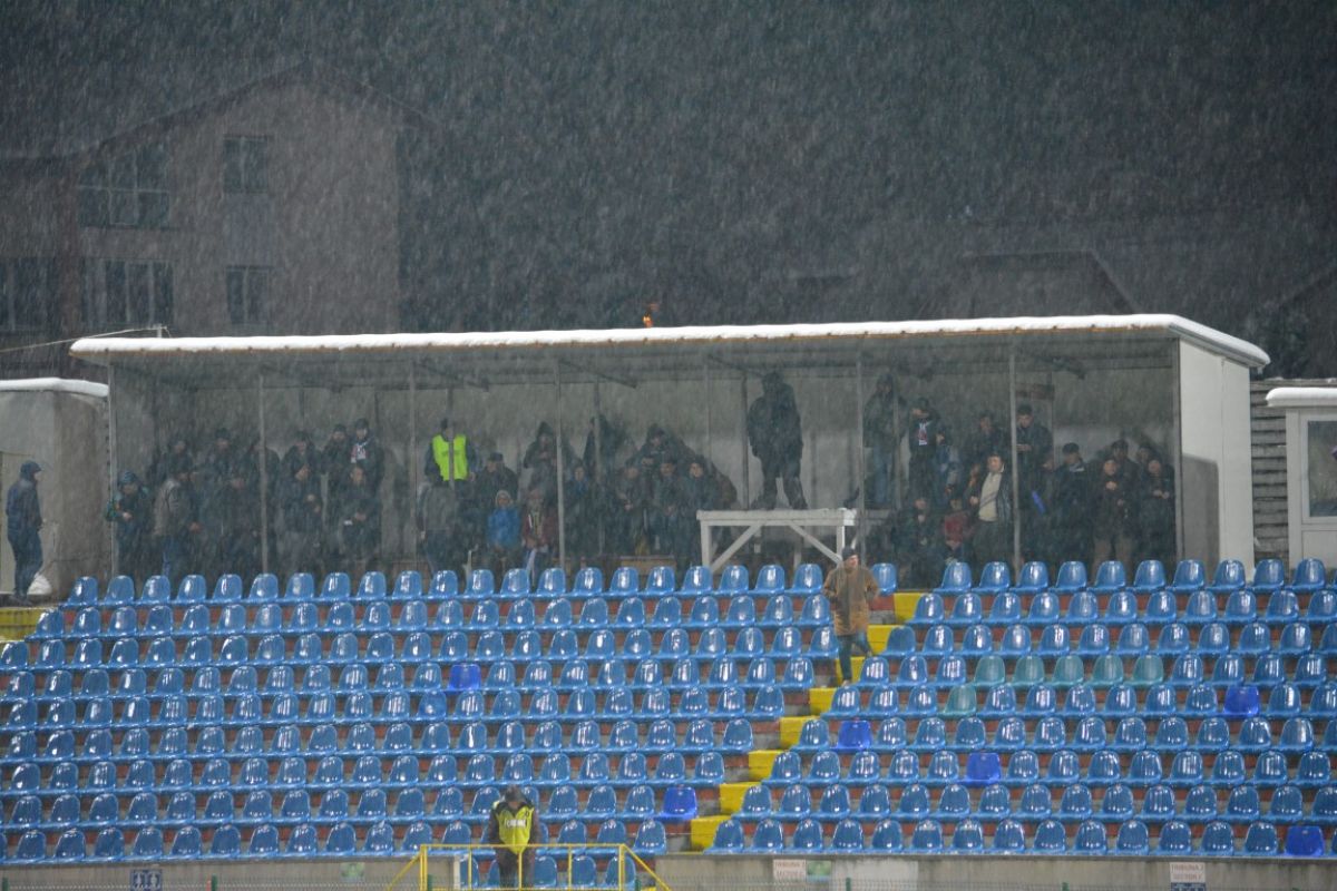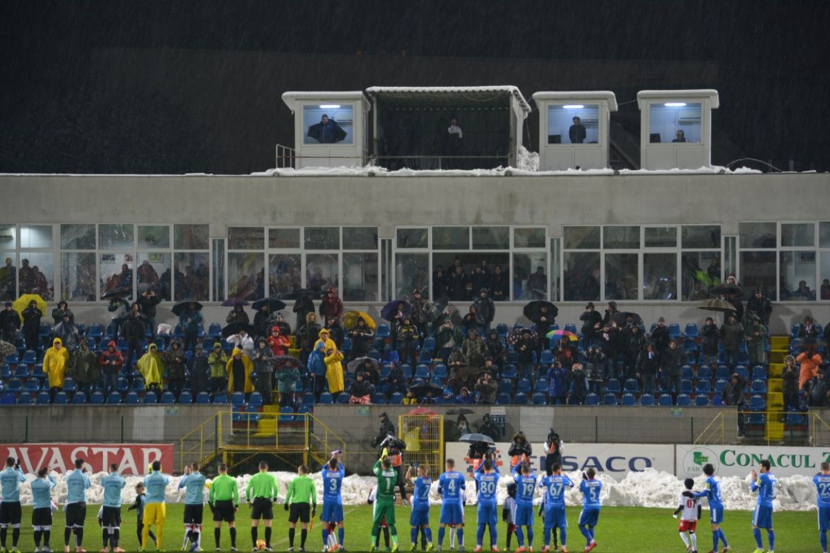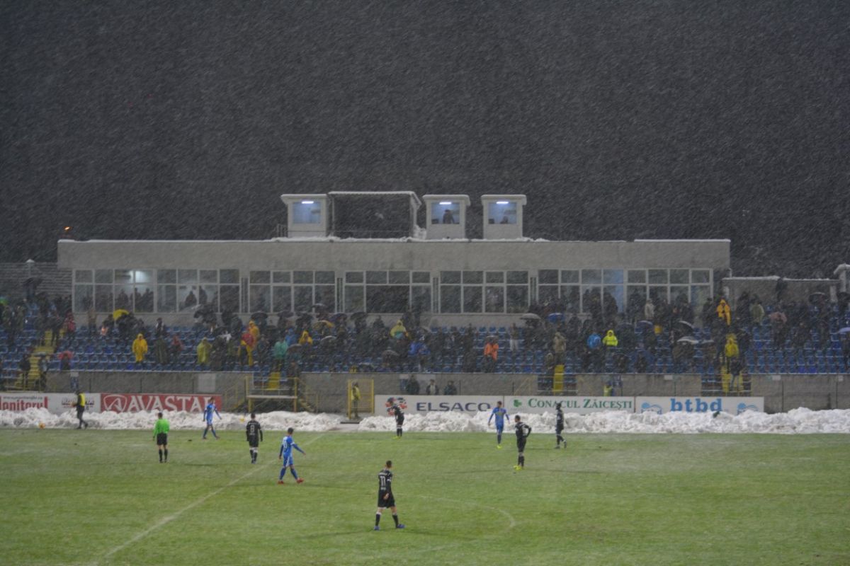 Au fost doar vreo 500 de oameni pe Stadionul Municipal, unde de altfel doar din tribune s-a degajat zăpada, peluzele fiind în mare parte albe. Cu excepţia câtorva locuri la peluza Ion Bordeanu şi a sectorului rezervat oaspeţilor, 15 fani ai oltenilor venind de la celălalt capăt al ţării pentru a-şi susţine favoriţii.