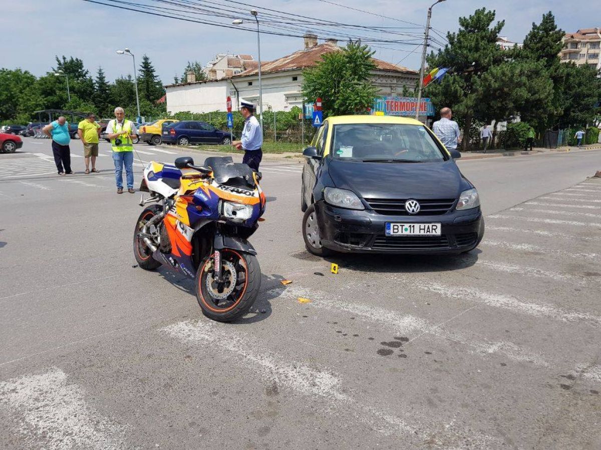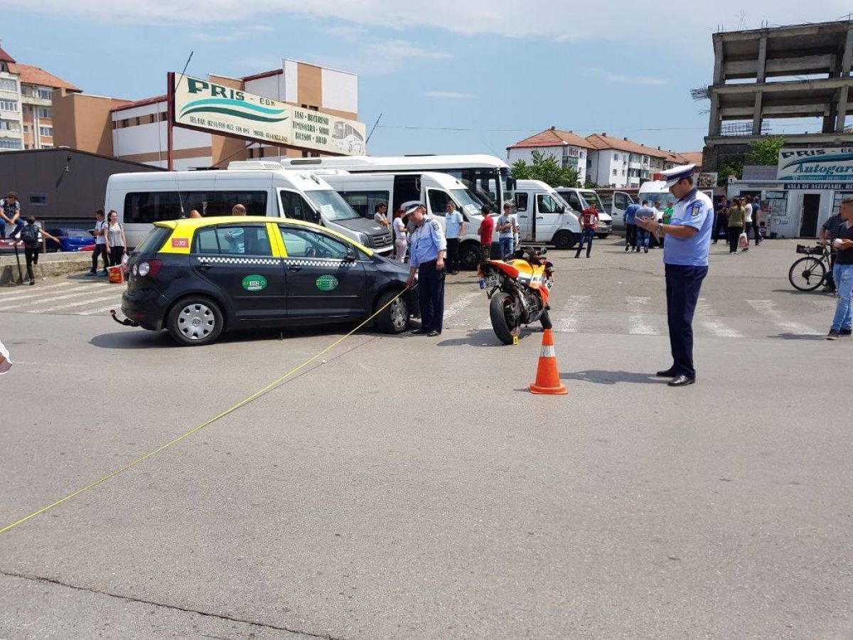Implicați au fost un motociclist și un taximetru. Primul dintre aceștia, urca pe strada Nicolae Iorga către Colegiul Național AT Laurian.