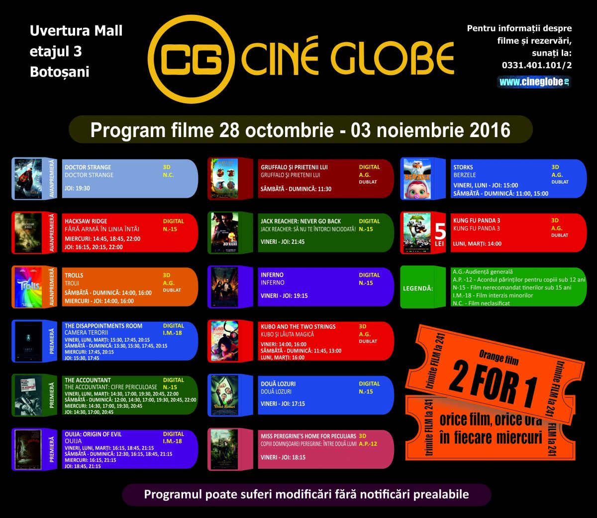 Reprezentanții Cine Globe au pregătit pentru botoșănenii iubitori de film, în perioada 28 octombrie – 3 noiembrie 2016, trei avanpremieră și trei premiere pe marile ecrane ale multiplexului din incinta Uvertura Mall.