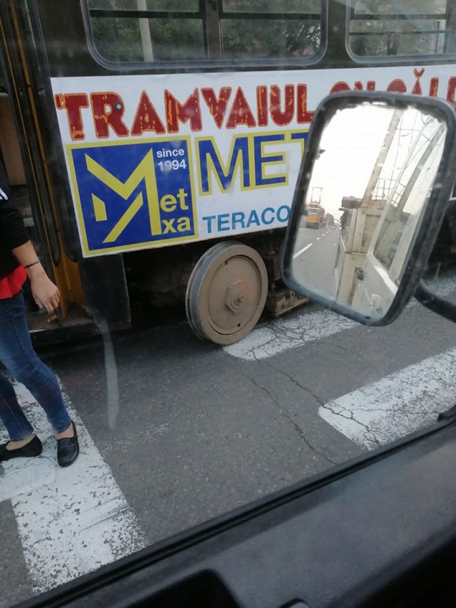 Joi, tramvaiul a fost tractat de către reprezentanții Eltrans după ce mecanismul care face legătura cu cablul de curent electric s-a rupt și a căzut pe carosabil.