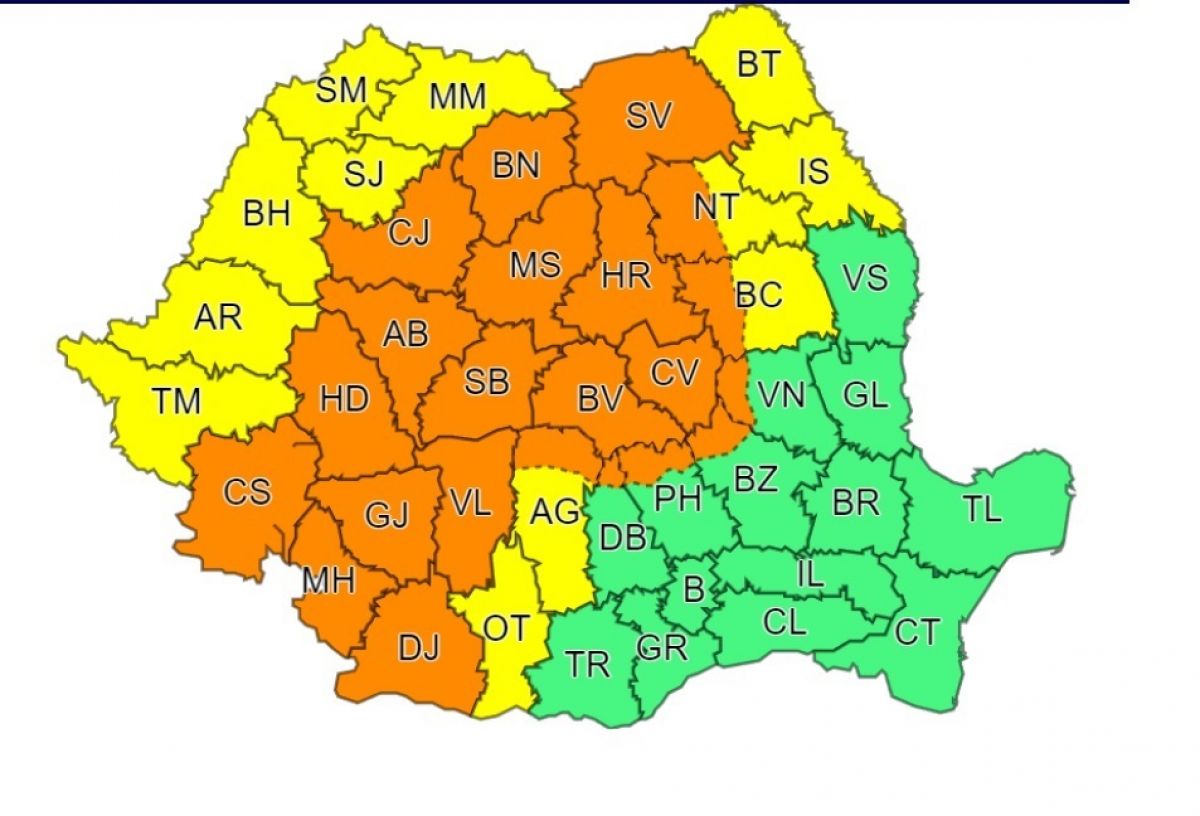În zona de munte, sudul Banatului, în cea mai mare parte a Olteniei și a Transilvaniei și în nordvestul Moldovei vor fi averse torențiale, descărcări electrice, vijelii și grindină de medii dimensiuni, iar în intervale scurte de timp (1-3 ore) sau prin acumulare cantitățile de apă vor fi de 30 - 40 l/mp și izolat peste 50 - 70 l/mp.