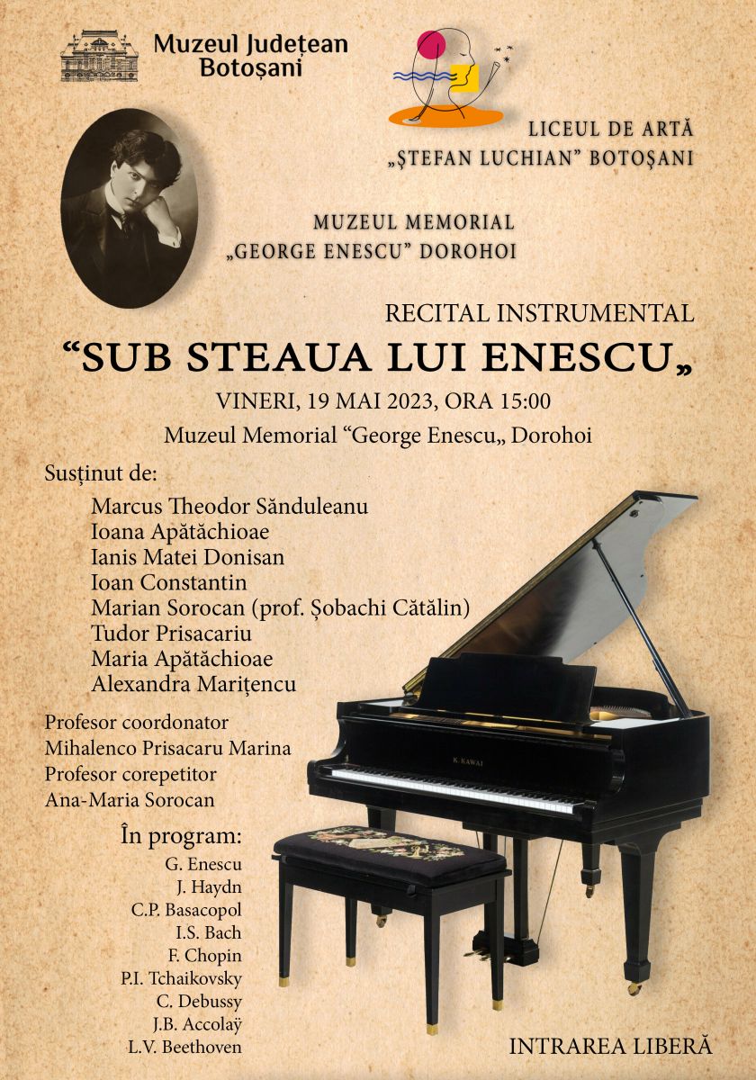 Muzeul Județean Botoșani organizează vineri, 19 mai 2023, începând cu ora 15.00, în Sala Polivalentă a Muzeului Memorial „George Enescu” Dorohoi, recitalul instrumental „Sub steaua lui Enescu” (II).