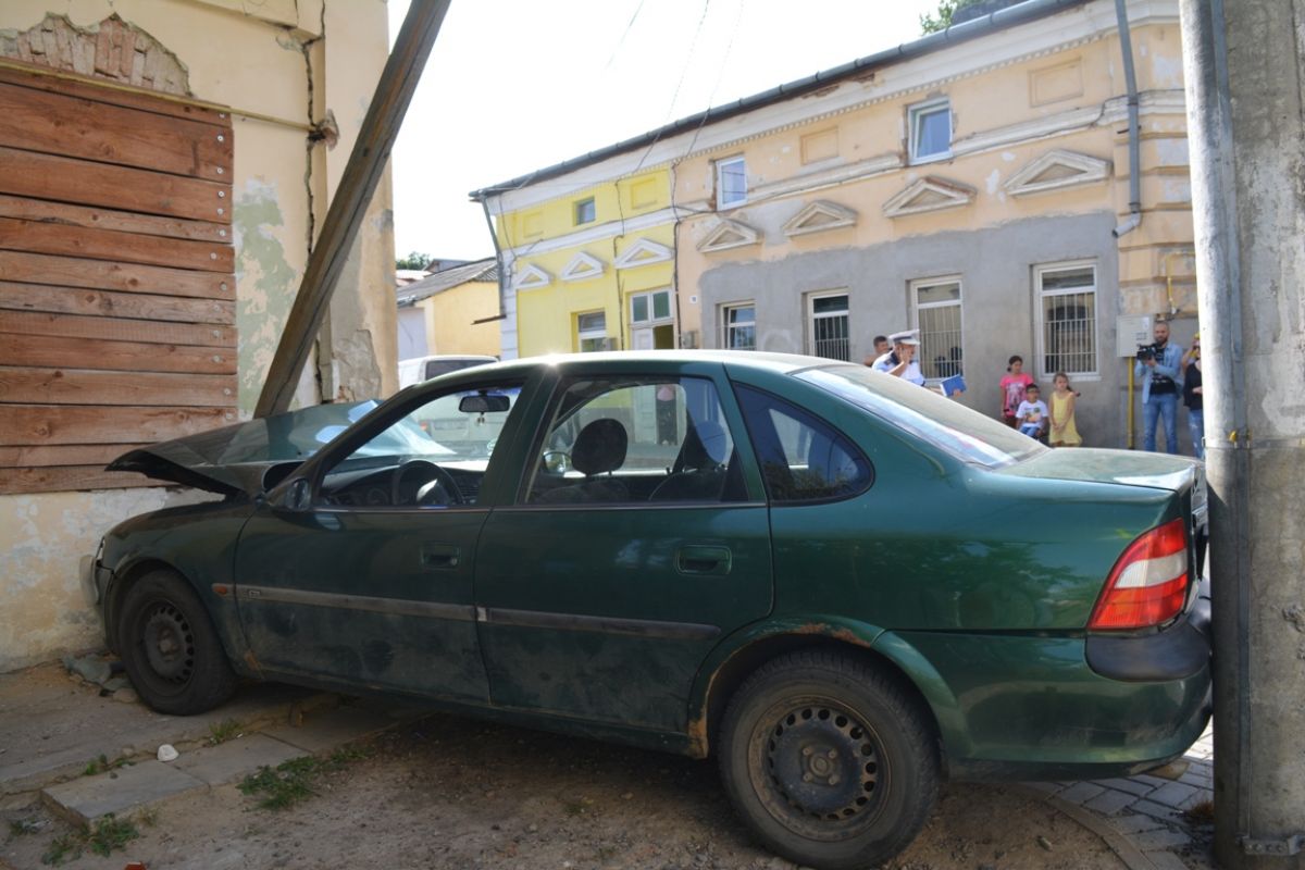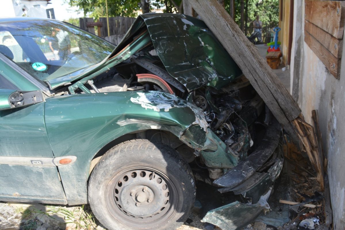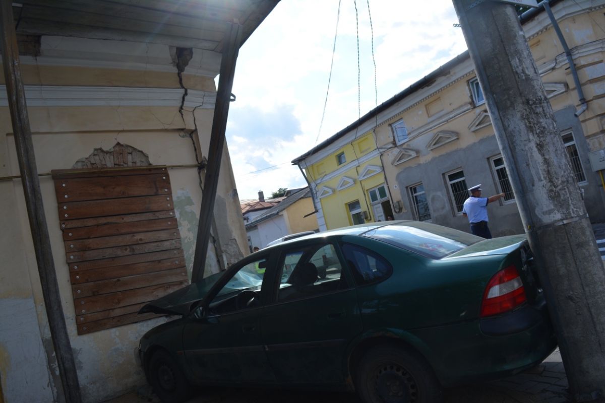 A ieşit astfel de pe carosabil şi a intrat în casa unei familii, rupându-i un stâlp de susţinere a imobilului.