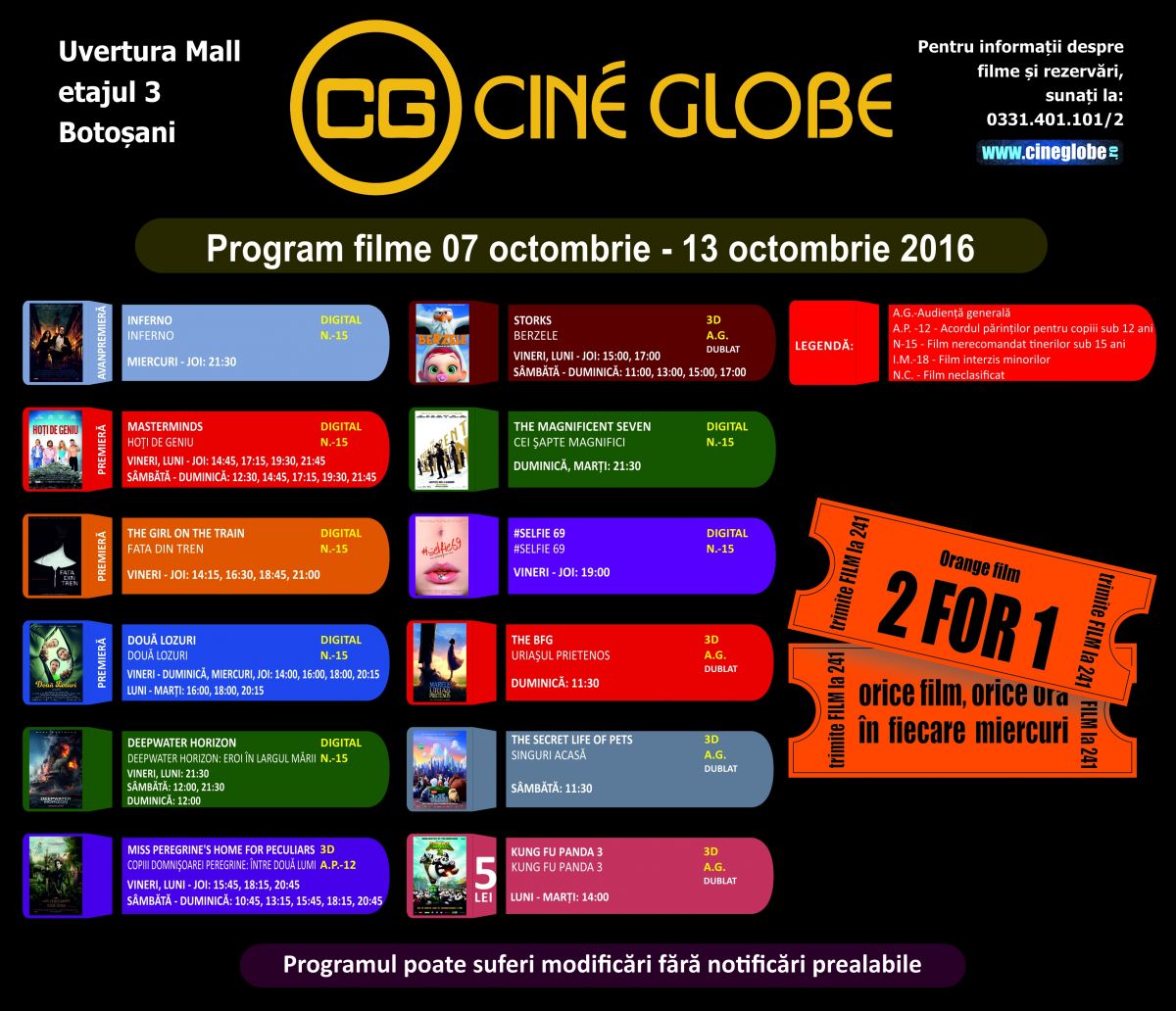 Reprezentanții Cine Globe au pregătit în perioada 7 octombrie - 13 octombrie 2016, o avanpremieră și trei premiere pe marile ecrane ale multiplexului din incinta Uvertura Mall.