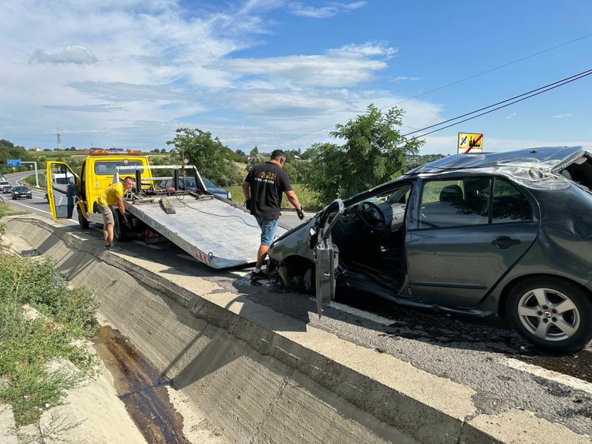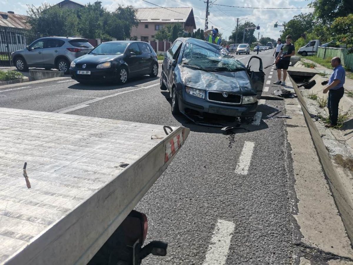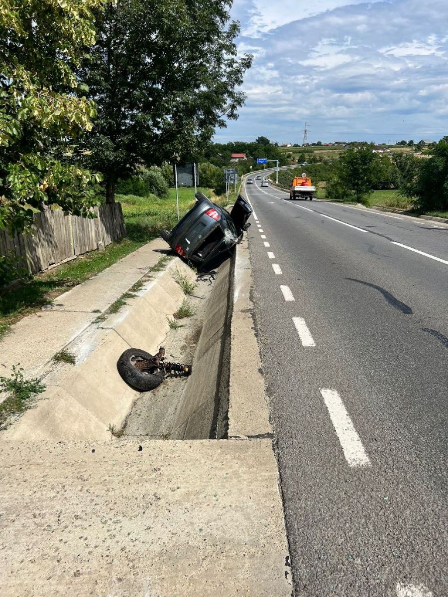Skoda pe care o conducea s-a răsturnat în șanț, iar impactul a fost atât de puternic încât o roată a sărit de pe ax și a rămas la câțiva metri de autoturism.