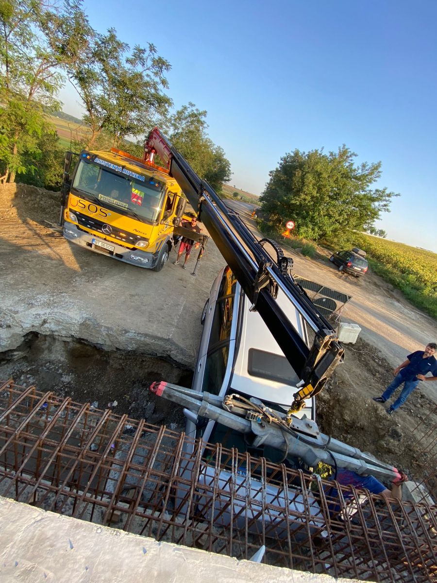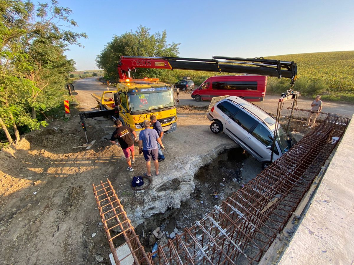 Într-o zonă în care se construiește un viaduct, autoturismul a intra cu partea din față în groapa uriașă, însă din fericire mașina s-a oprit și a rămas suspendată.