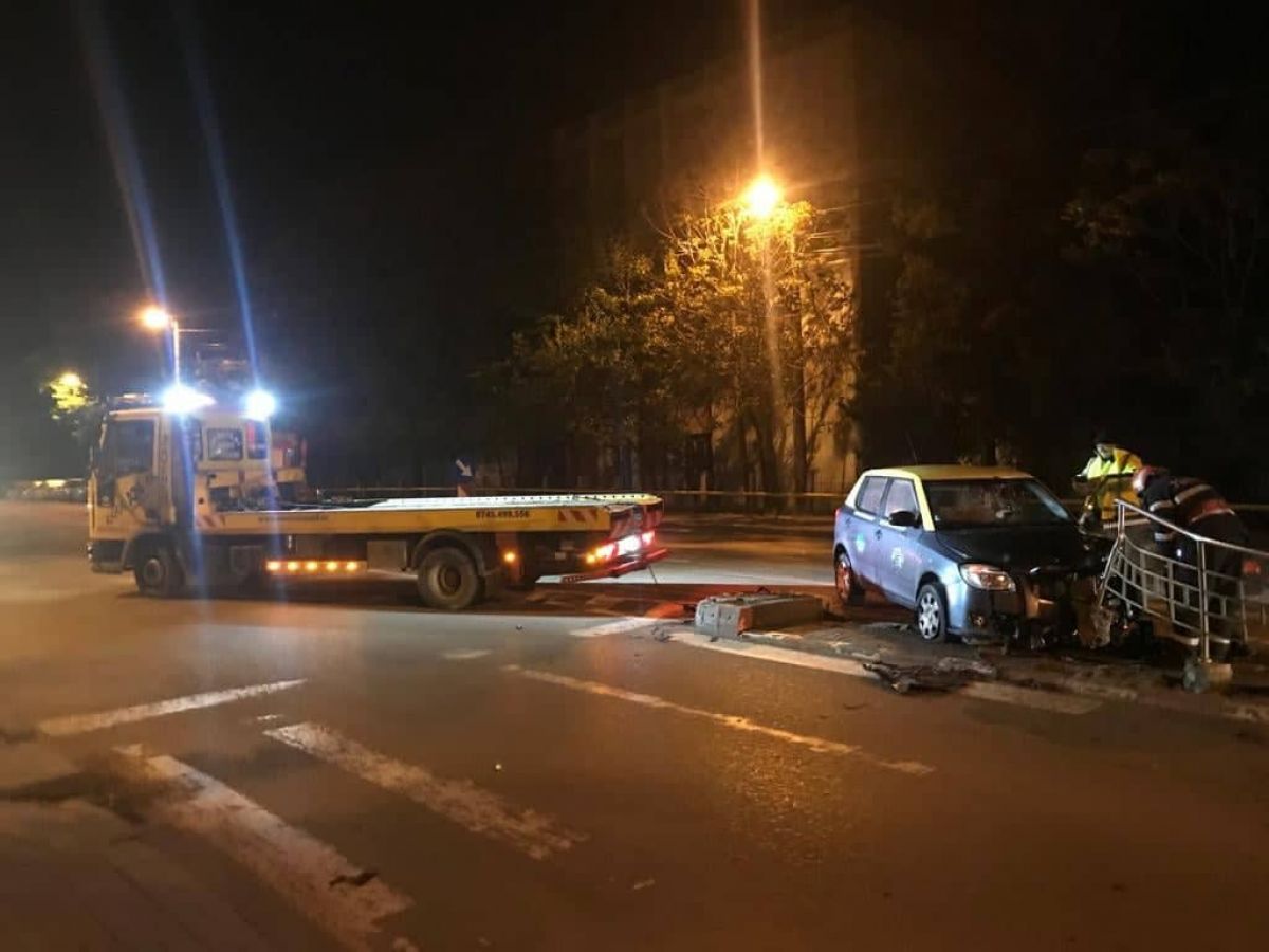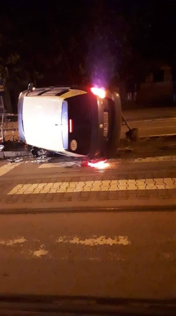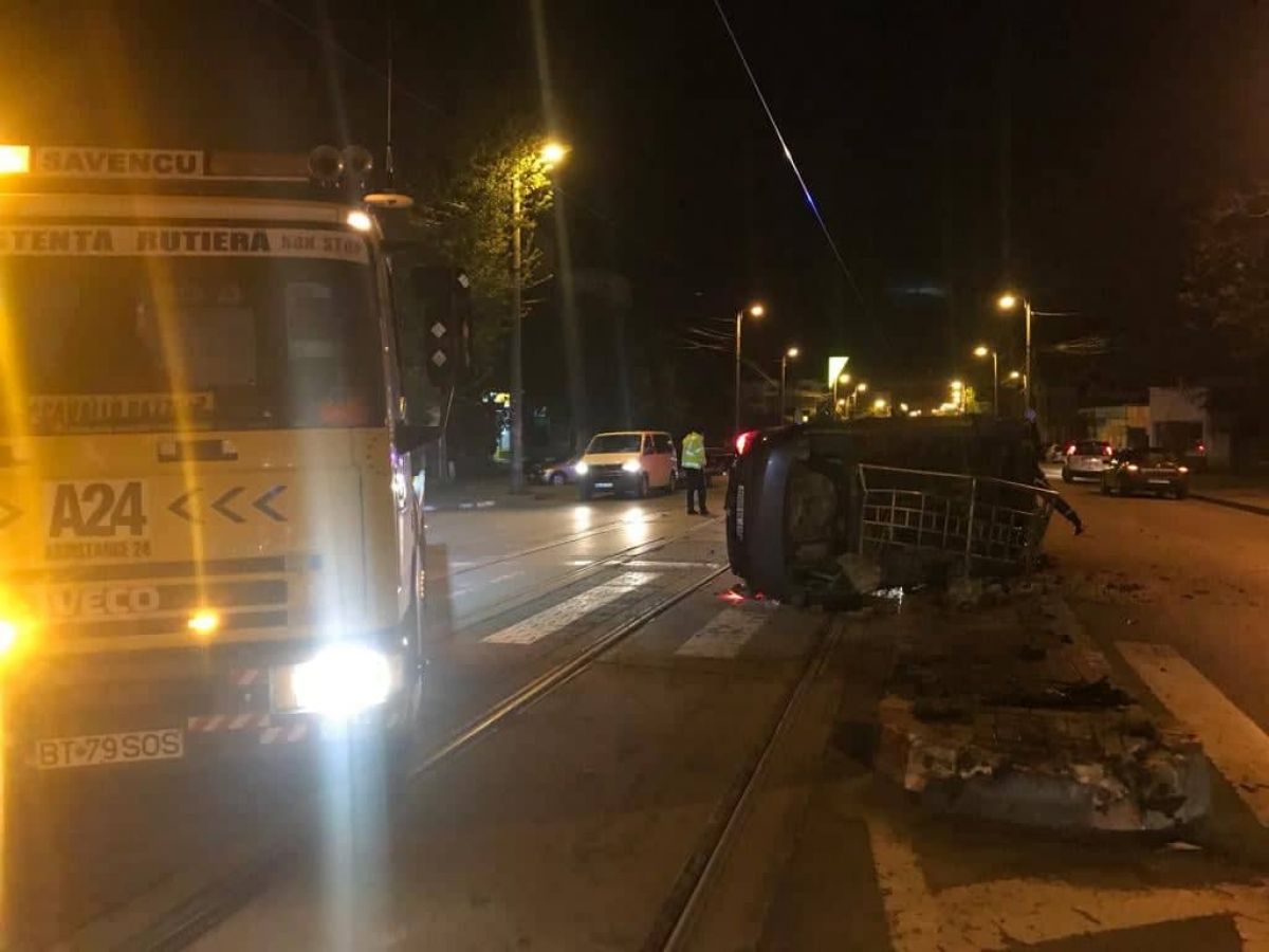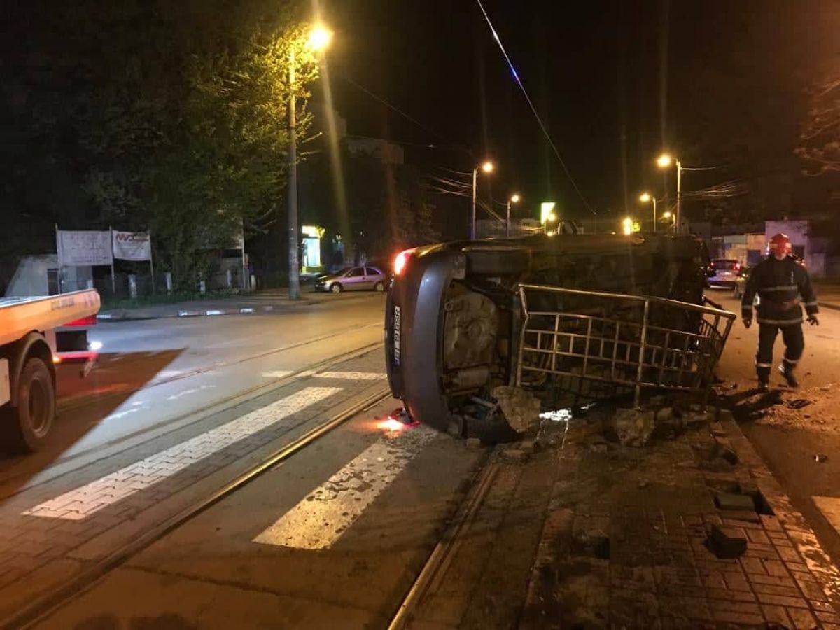 Este vorba de o Skoda pe care o conducea pe Calea Națională și cu care în zona fostului Liceu Textil s-a răsturnat și a lovit bara de la un refugiu pentru călătorii tramvaielor.