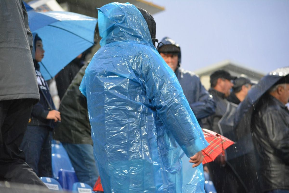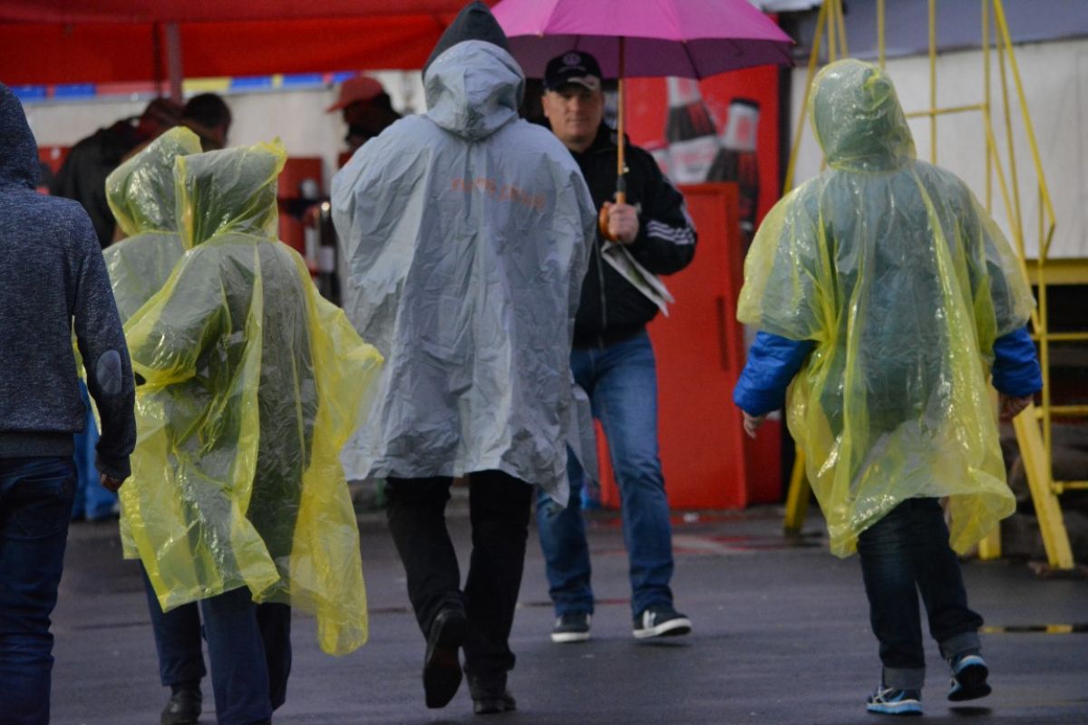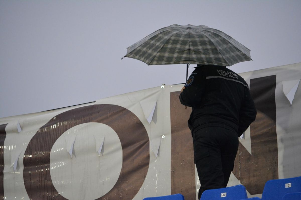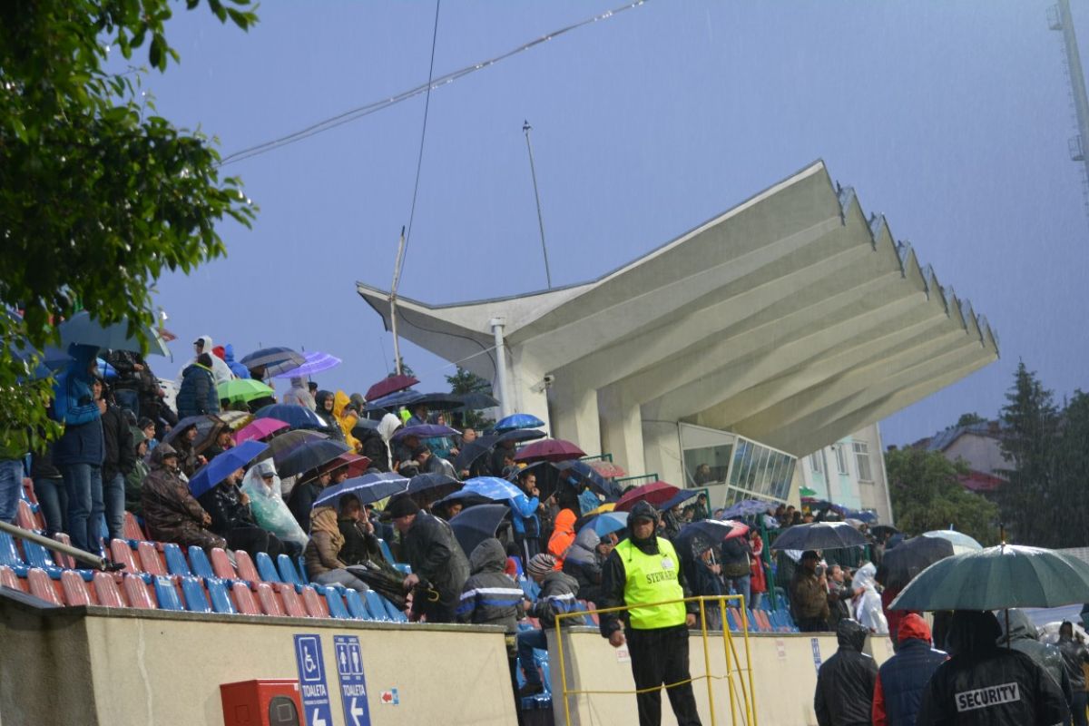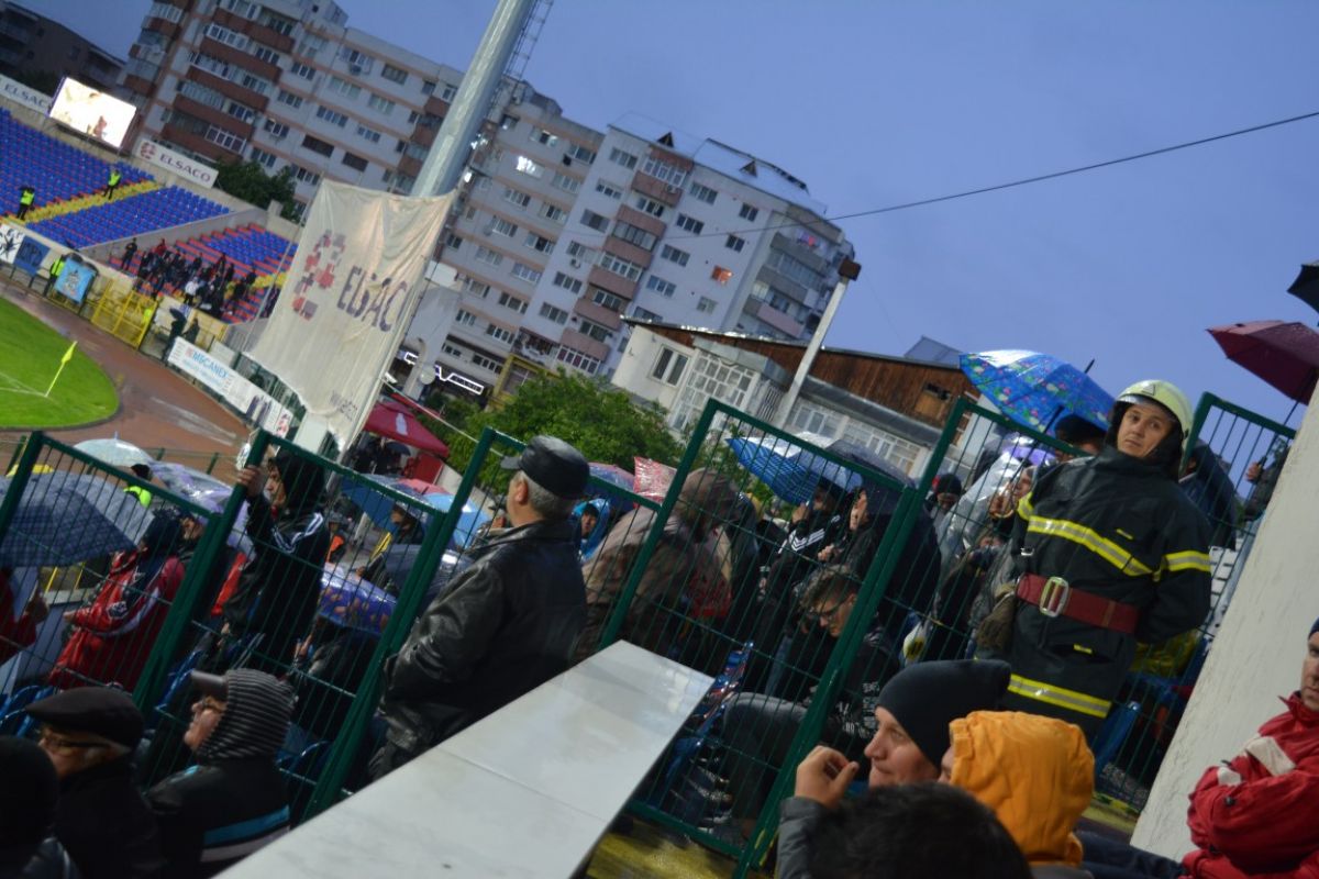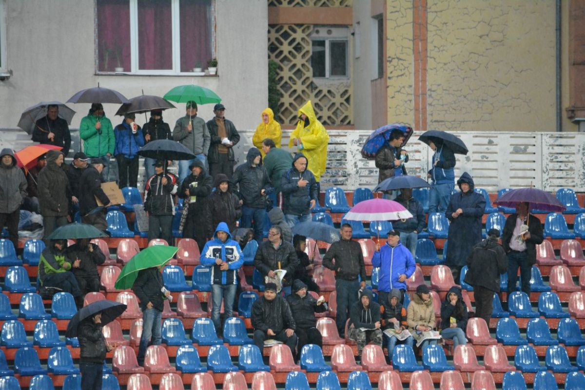 În jur de 1.000 de spectatori au înfruntat totuşi vremea nefavorabilă şi s-au deplasat la Stadionul Municipal. Pentru a face faţă precipitaţiilor abundente microbiştii au venit în pelerine de ploaie, în geci de fâş, cu tot felul de coifuri şi de căciuli şi, bineînţeles, o puzderie de umbrele. Unii dintre aceştia par de-a dreptul camuflaţi. Vremea este sfidată însă de un fan care a luat loc la peluza Ion Bordeanu şi care vizionează confruntarea în pantaloni scurţi. (S.B.)
