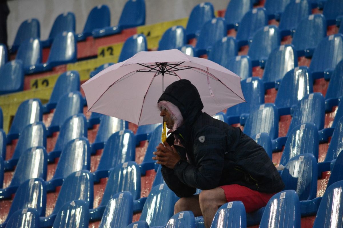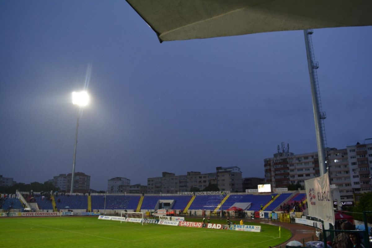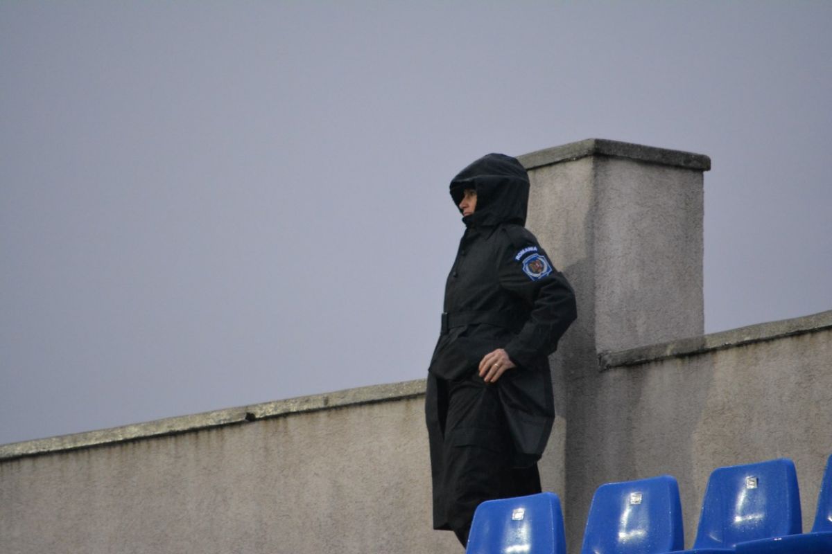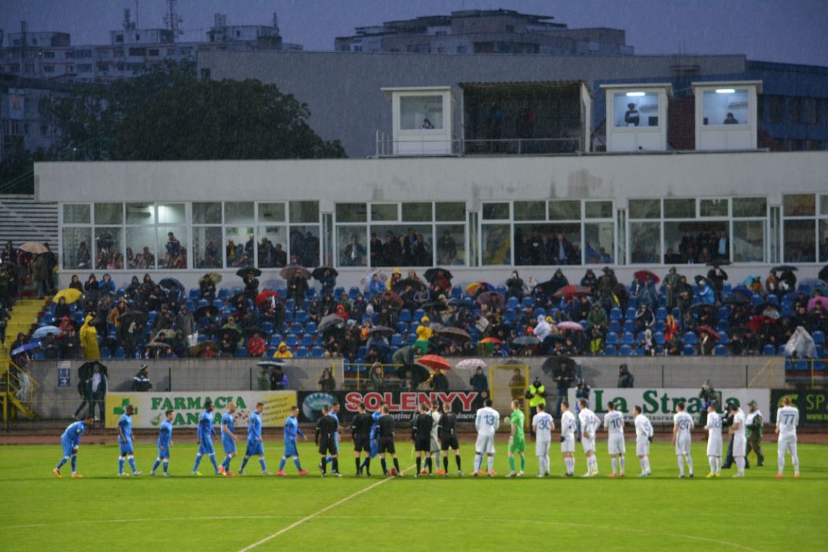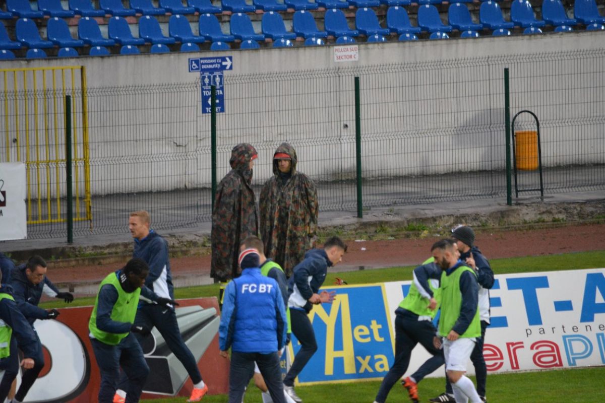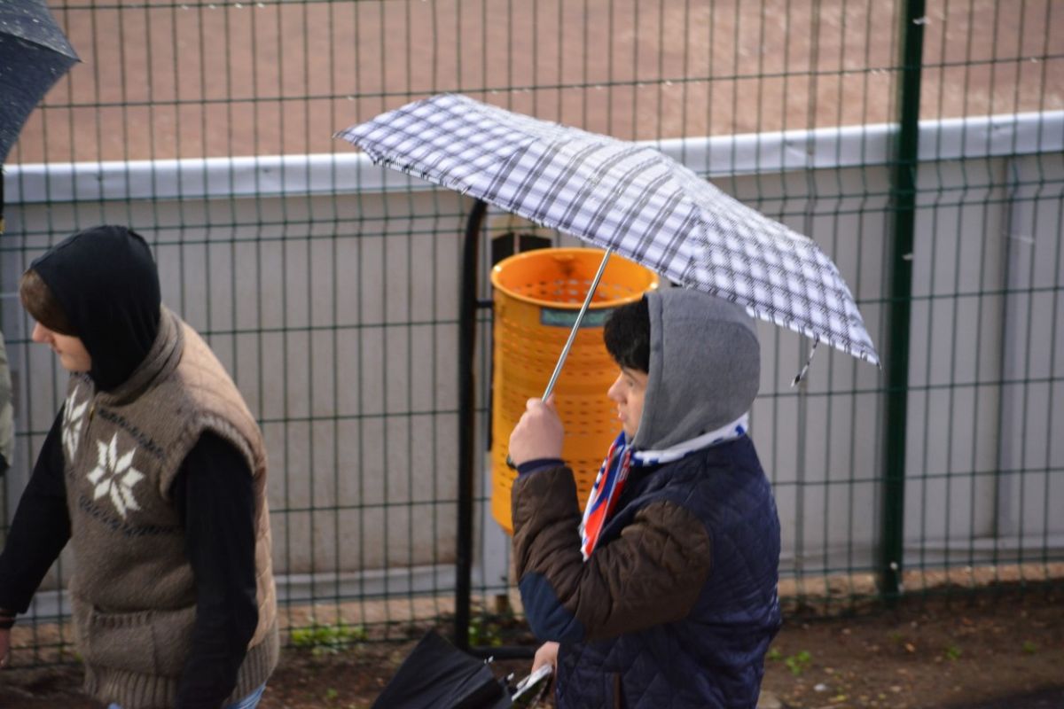 În jur de 1.000 de spectatori au înfruntat totuşi vremea nefavorabilă şi s-au deplasat la Stadionul Municipal. Pentru a face faţă precipitaţiilor abundente microbiştii au venit în pelerine de ploaie, în geci de fâş, cu tot felul de coifuri şi de căciuli şi, bineînţeles, o puzderie de umbrele. Unii dintre aceştia par de-a dreptul camuflaţi. Vremea este sfidată însă de un fan care a luat loc la peluza Ion Bordeanu şi care vizionează confruntarea în pantaloni scurţi. (S.B.)