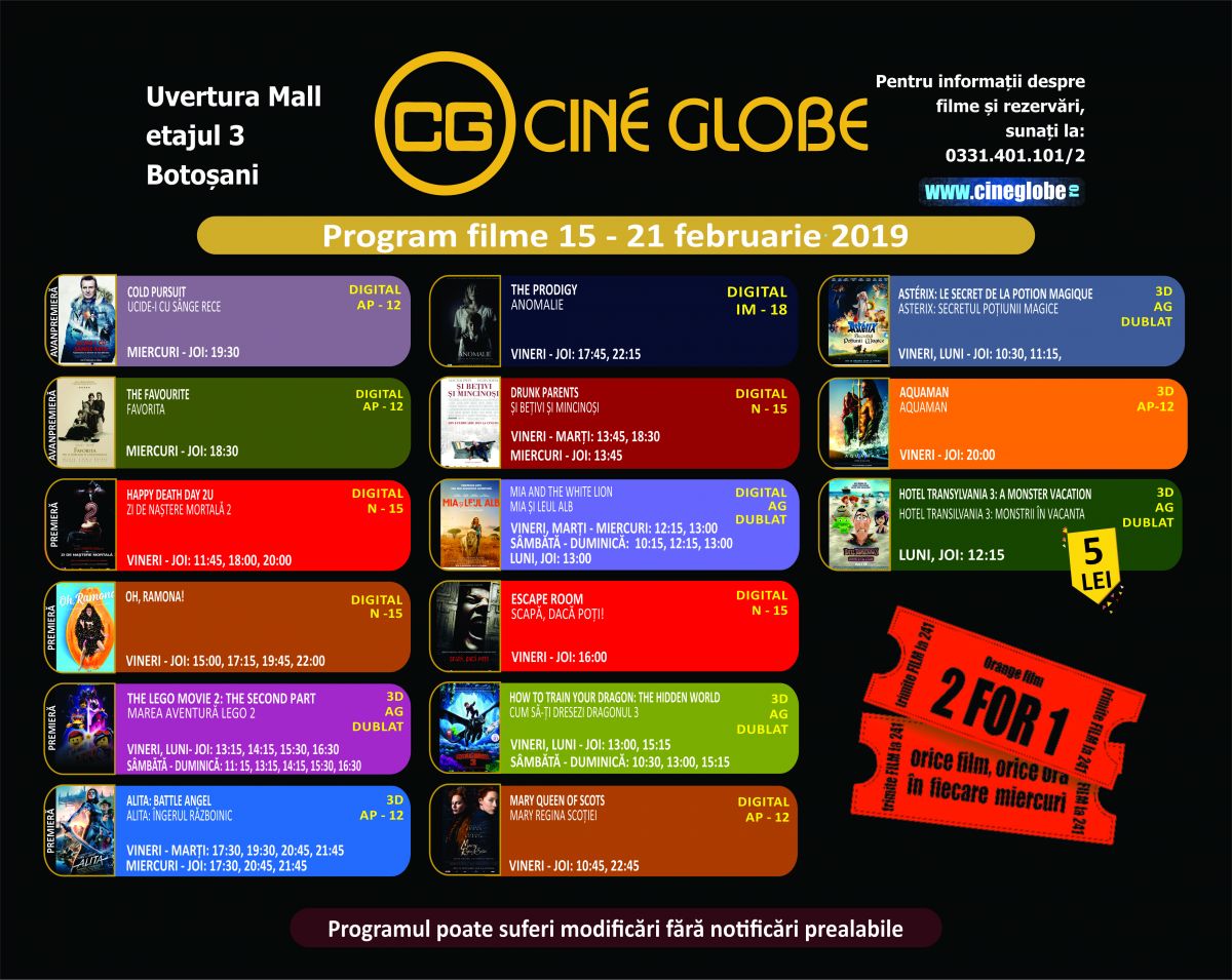 Reprezentanții Cine Globe aflat în incinta Uvertura Mall au transmis programul de difuzare pentru săptămâna 15 – 21 februarie 2019.