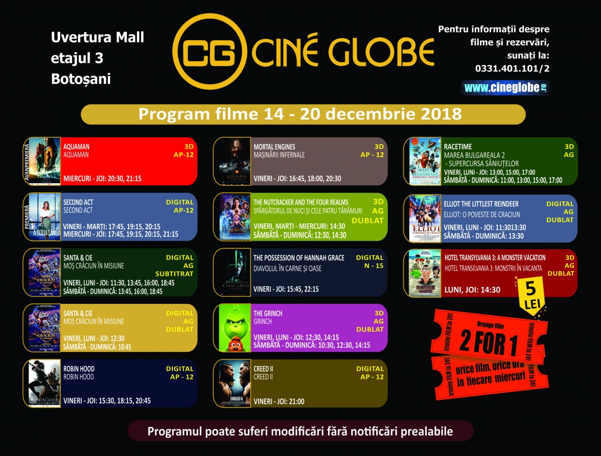 Programul Cine Globe include filme pentru toate gusturile: de la filme cu tematică de Crăciun, până la comedii și filme de acțiune. În plus, săptămâna următoare la Cine Globe ajunge super eroul Aquaman, cunoscut personaj din universul DC Comics.