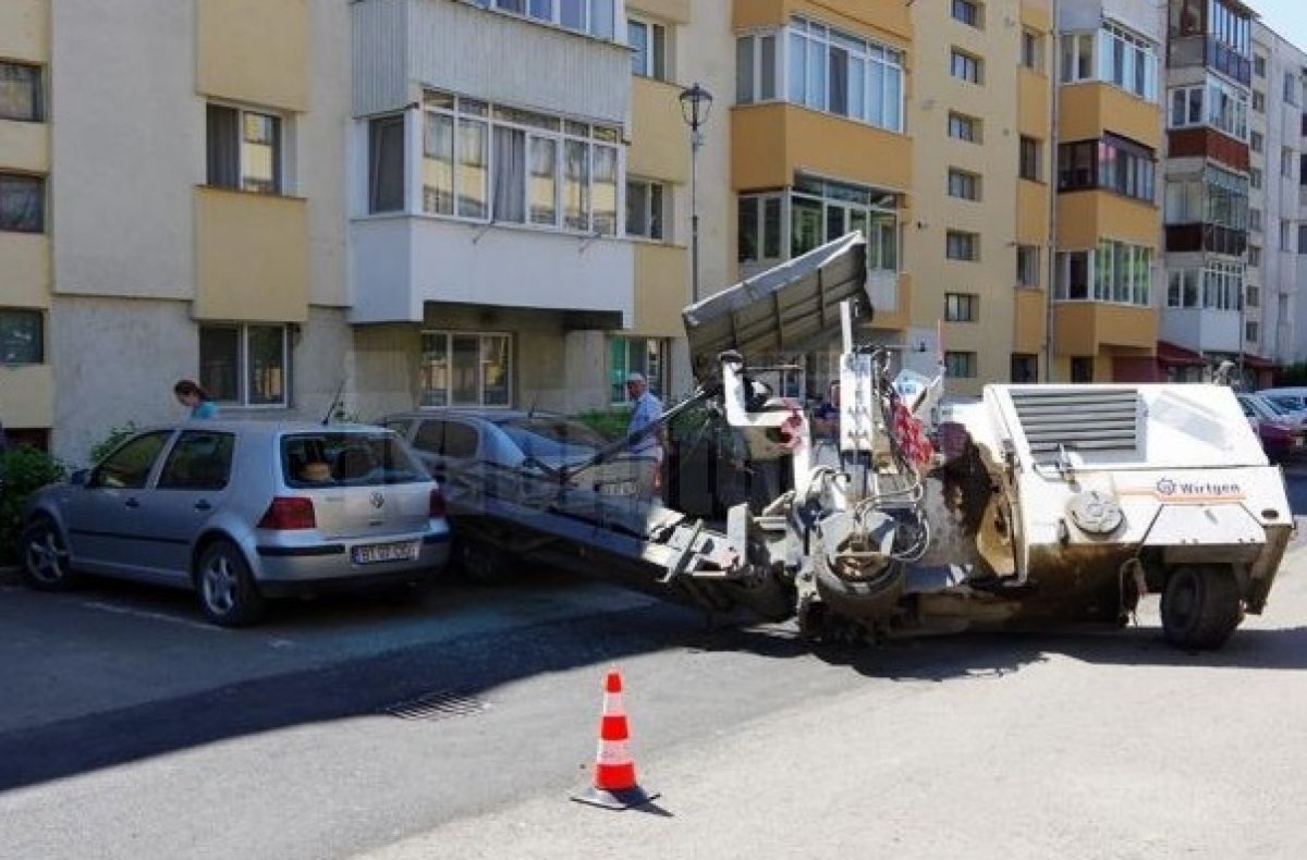 O autofreză de asfalt, care lucra la aducerea carosabilului la starea iniţială, după o lucrare de canalizare, s-a răsturnat căzând între două maşini, cărora le-a provocat avarii.