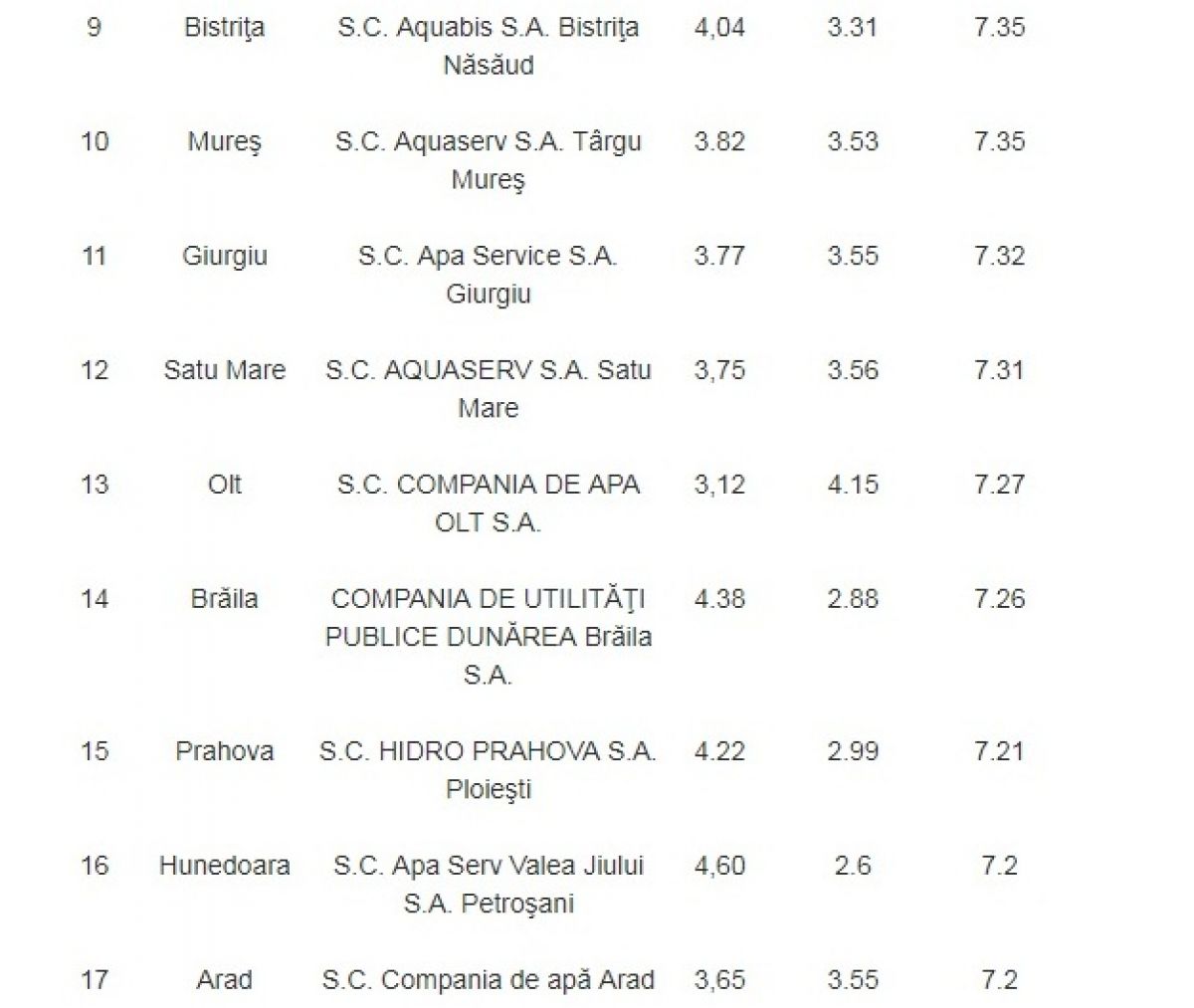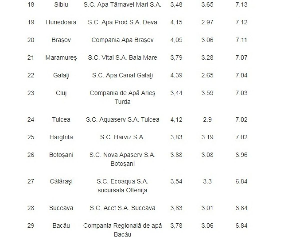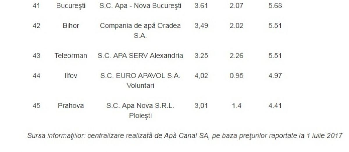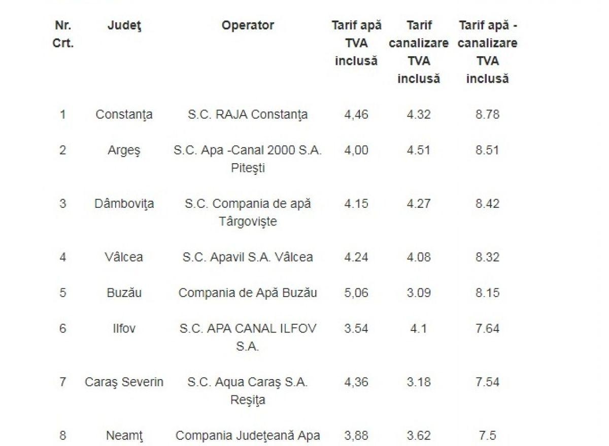 Cum facturile emise pe numele românilor nu includ doar costurile livrării apei potabile, ci şi cele aferente serviciilor de canalizare, clasamentul întocmit în funcţie de preţul apei se modifică. Astfel, pentru fiecare metru cub de apă consumată şi, mai apoi, ajunsă în sistemul de canalizare, cel mai mic preţ îl au locuitorii din judeţul Prahova: 4,41 de lei, cu tot cu TVA. Urmează locuitorii din Ilfov (4,97 de lei) şi, respectiv, cei din Teleorman (4,97 de lei). În topul clasamentului se află constănţenii (8,78 de lei pe metrul cub de apă şi metrul cub de apă ajuns în canalizare), urmaţi de locuitorii judeţelor Argeş (8,51 lei) şi, respectiv, Dâmboviţa (8,42 de lei). Media preţului pentru un metru de apă şi canal la nivel naţional este de 6,85 de lei, cu tot cu TVA. (Sursa: Adevărul)