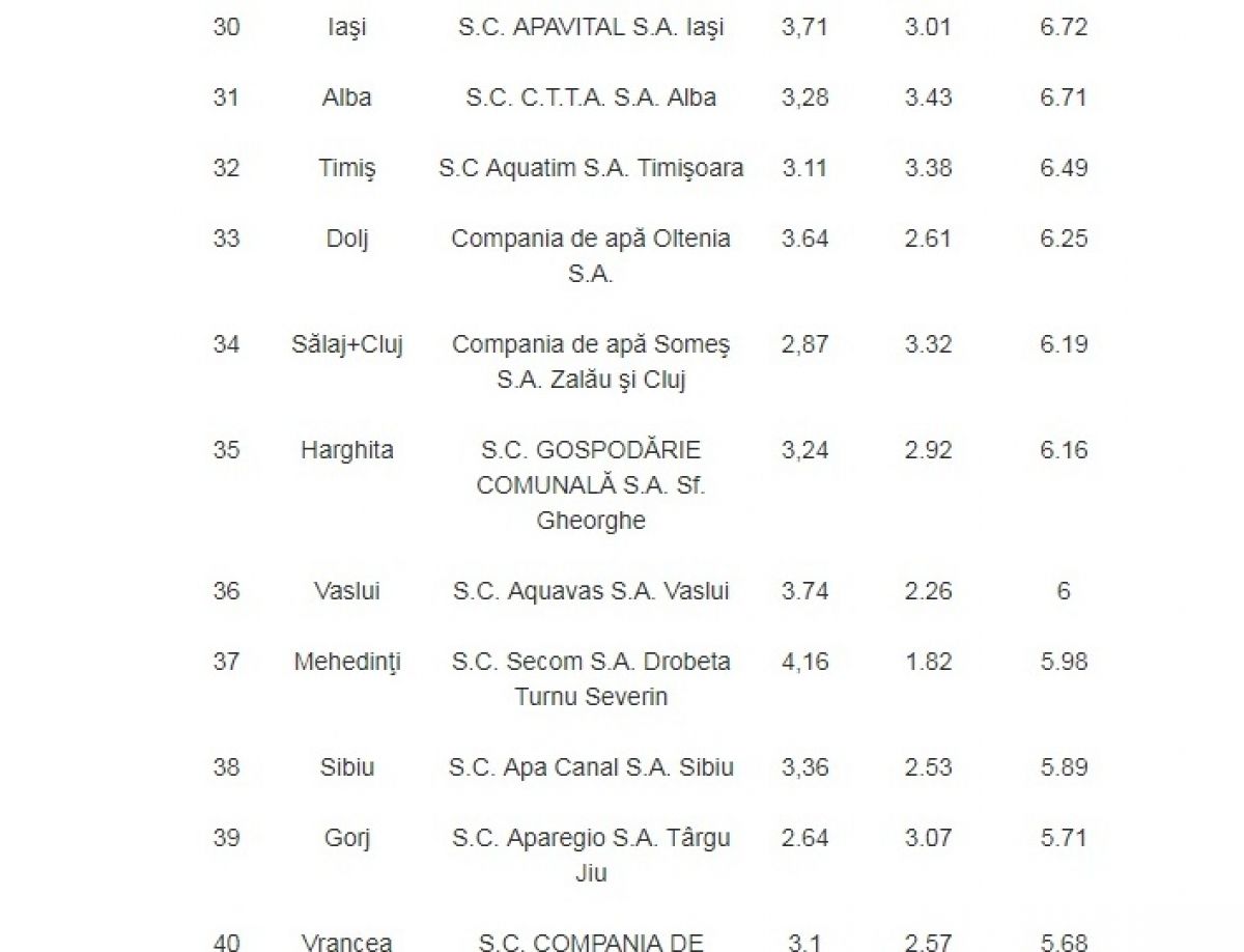 Cea mai ieftină apă este furnizată la robinetele locuitorilor din Gorj: 2,64 de lei, cu tot cu TVA. Locuitorii din Cluj şi Sălaj sunt, de asemenea, în topul celor care plătesc cele mai mici preţuri pentru furnizarea apei potabile, compania de apă din aceste judeţe facturând 2,87 de lei, cu tot cu TVA, pentru fiecare metru cub de apă înregistrat de contoare.