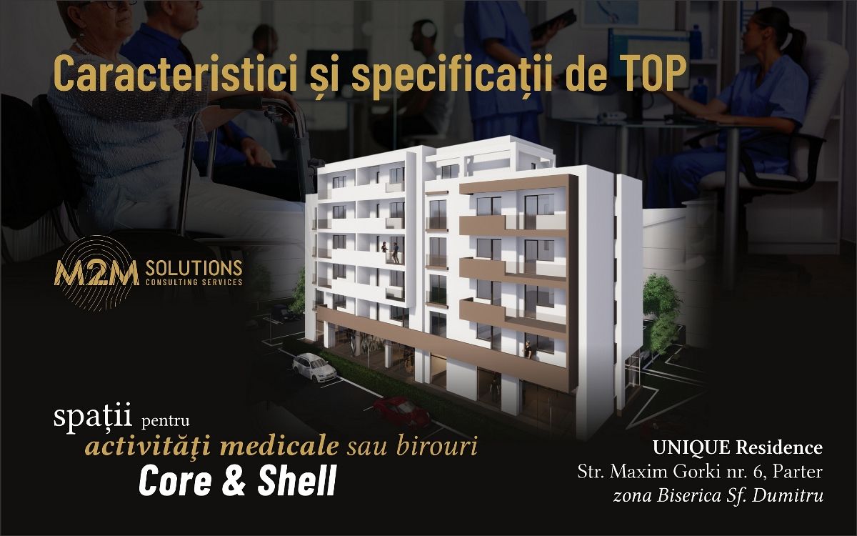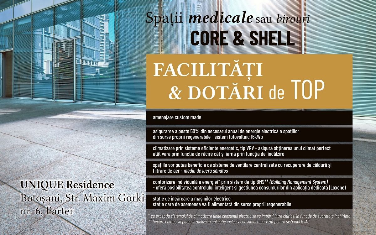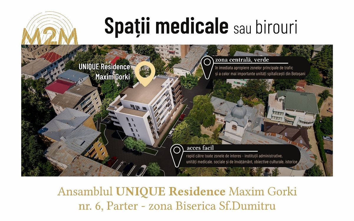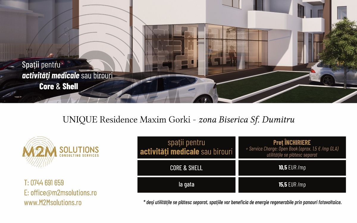 Conceput după cele mai exigente standarde de siguranță și confort, ansamblul UNIQUE Residence Maxim Gorki pune la dispoziție facilități de business în zona de parter - spații pentru activități medicale (centre, clinici medicale, laboratoare /puncte de preluare analize medicale, cabinete medicale, de nutriție, veterinare, stomatologice etc.) sau birouri: