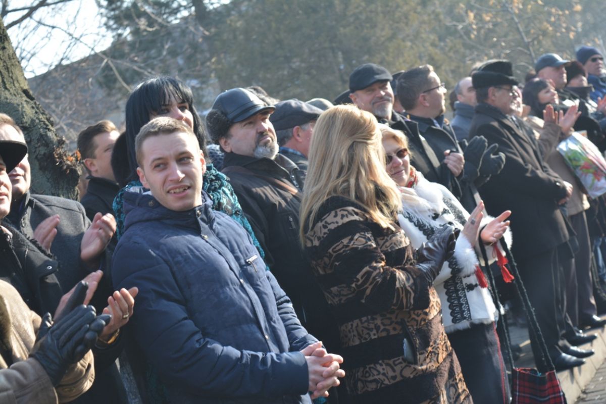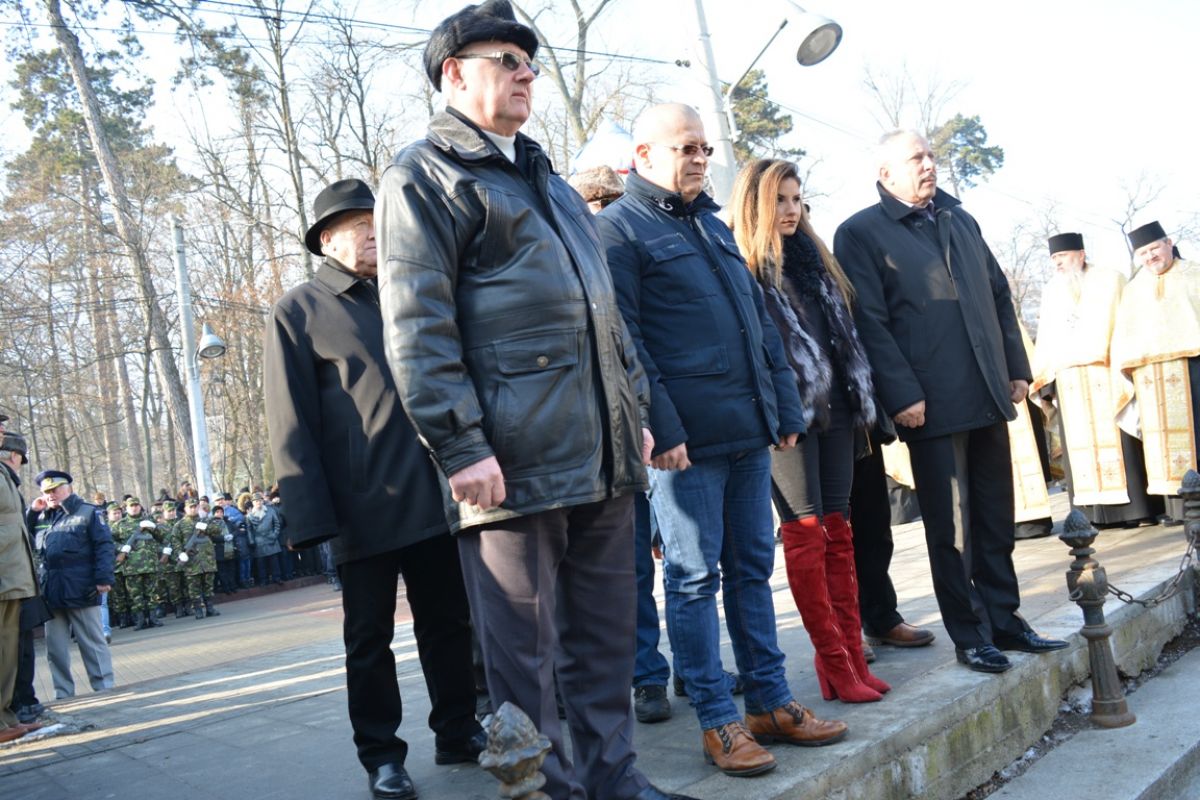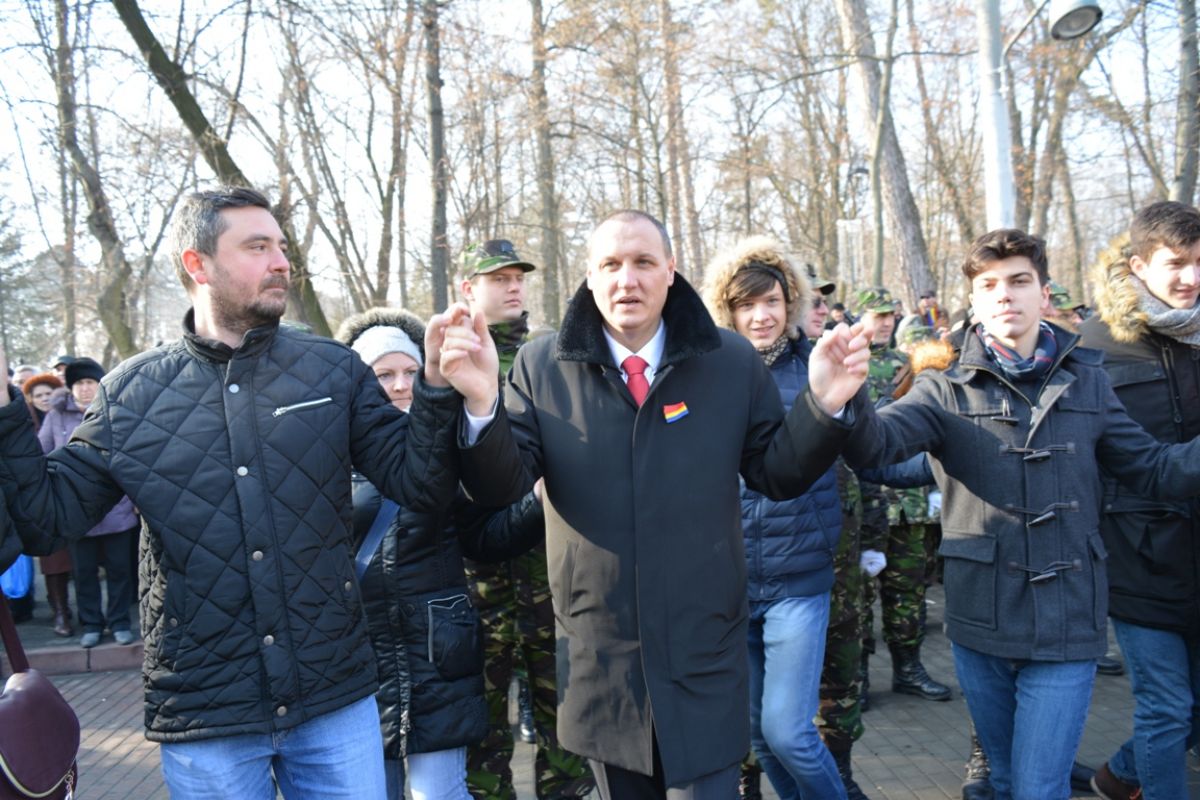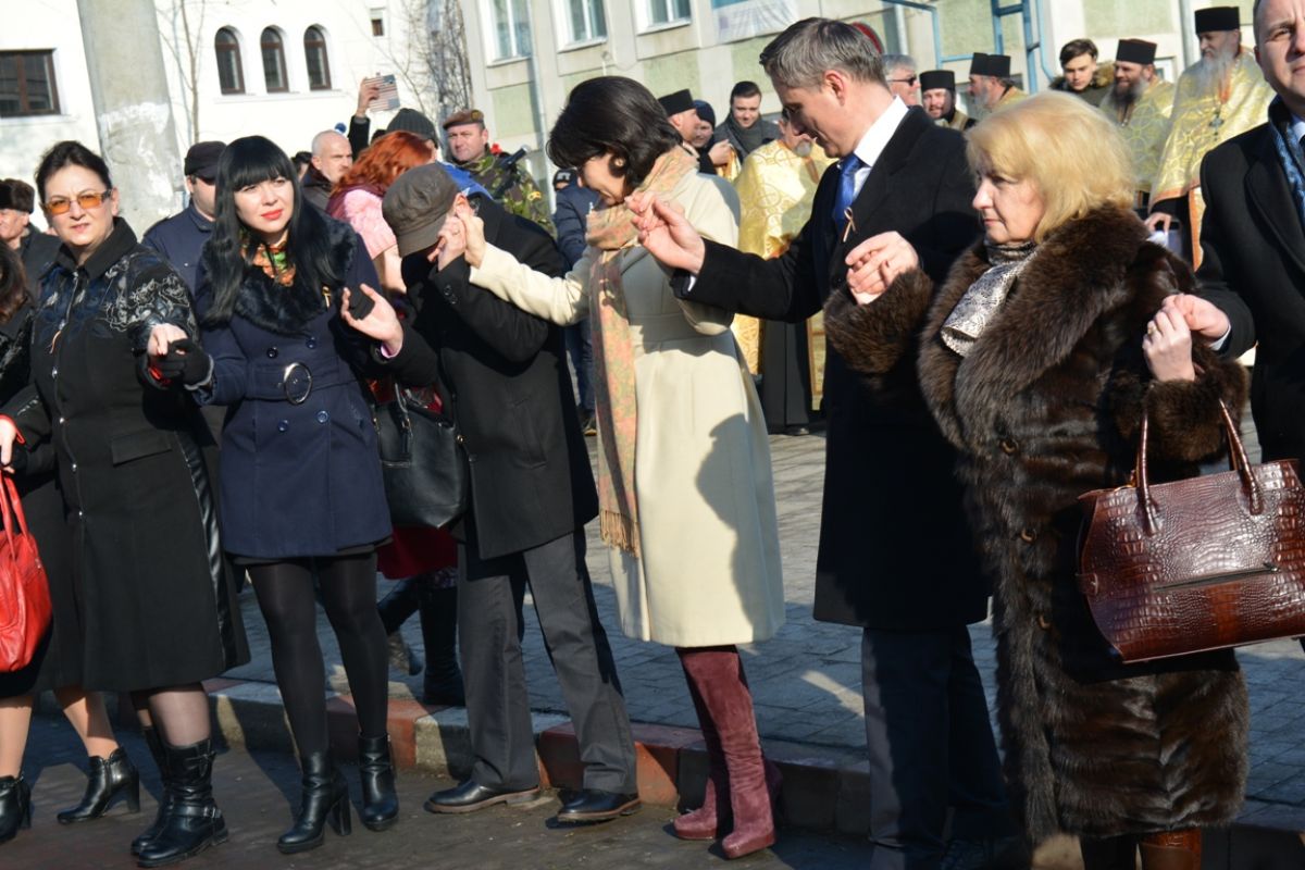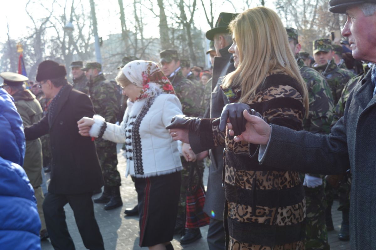 După slujba oficiată de un sobor format din opt preoţi şi depunerea de coroane, speaker-ul militar a îndemnat lumea să se prindă în horă. Câteva zeci de secunde cei prezenţi s-au codit să o facă, până ce câţiva liberali au spart gheaţa şi au ieşit în stradă, alături de ei prinzându-se ulterior şi PSD-iştii, dar şi ceilalţi participanţi la manifestare.