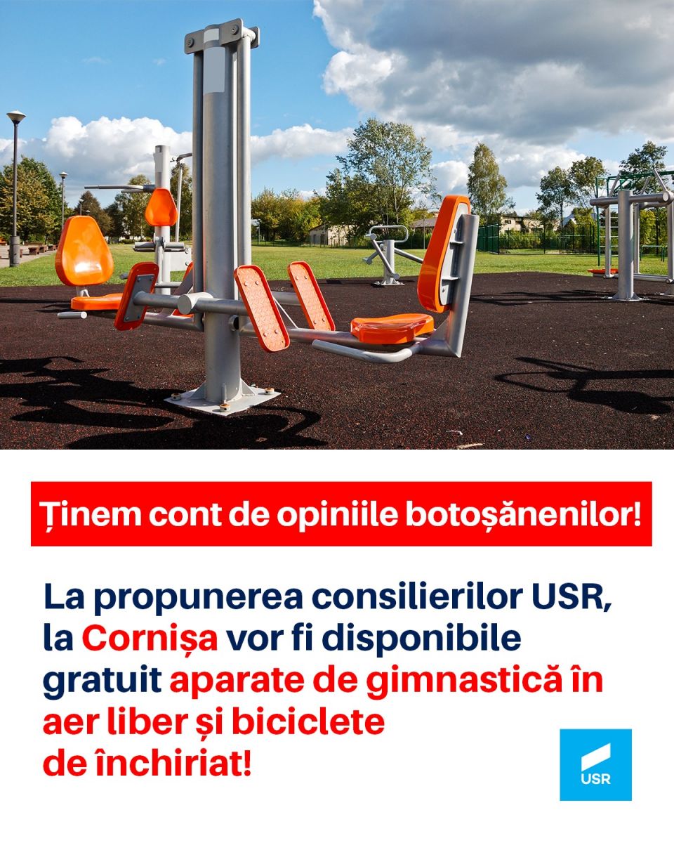 Consilierii USR consideră că preferințele botoșănenilor sunt mai mult decât binevenite, dată fiind importanța sportului și a mișcării în aer liber, după o perioadă în care cu toții ne-am obișnuit mai degrabă cu sedentarismul și cu limitarea în funcție de strictul necesar a ieșirilor. Totodată, continuarea achizițiilor în zona Cornișa și oferirea unor facilități noi ar fi o manieră corectă și de bun augur pentru toți botoșănenii.