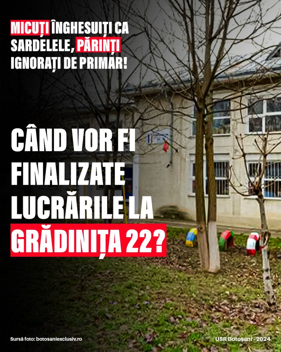 USR Botoșani scria în septembrie, anul trecut, despre nemulțumirile postate pe rețelele de socializare de părinții din zona ANL Cișmea, care se vedeau puși în situația de a-și duce copiii într-o sală în care trebuiau înghesuiți 52 de copii pe 14 paturi. Grădinița 22 era în reabilitare, iar părinții erau rugați să găsească alte soluții pentru micuți și să amâne aducerea la grădi pentru al doilea modul. Deși la începutul lui ianuarie a început al treilea modul, lucrările tot nu sunt gata. Din cauza întârzierilor, copiii de la Grădinița 22 sunt dispersați. Unii au fost transferați la Grădinița 20, care a devenit supraaglomerată, iar alții au rămas într-o secțiune a grădiniței în renovare, în condiții improprii.