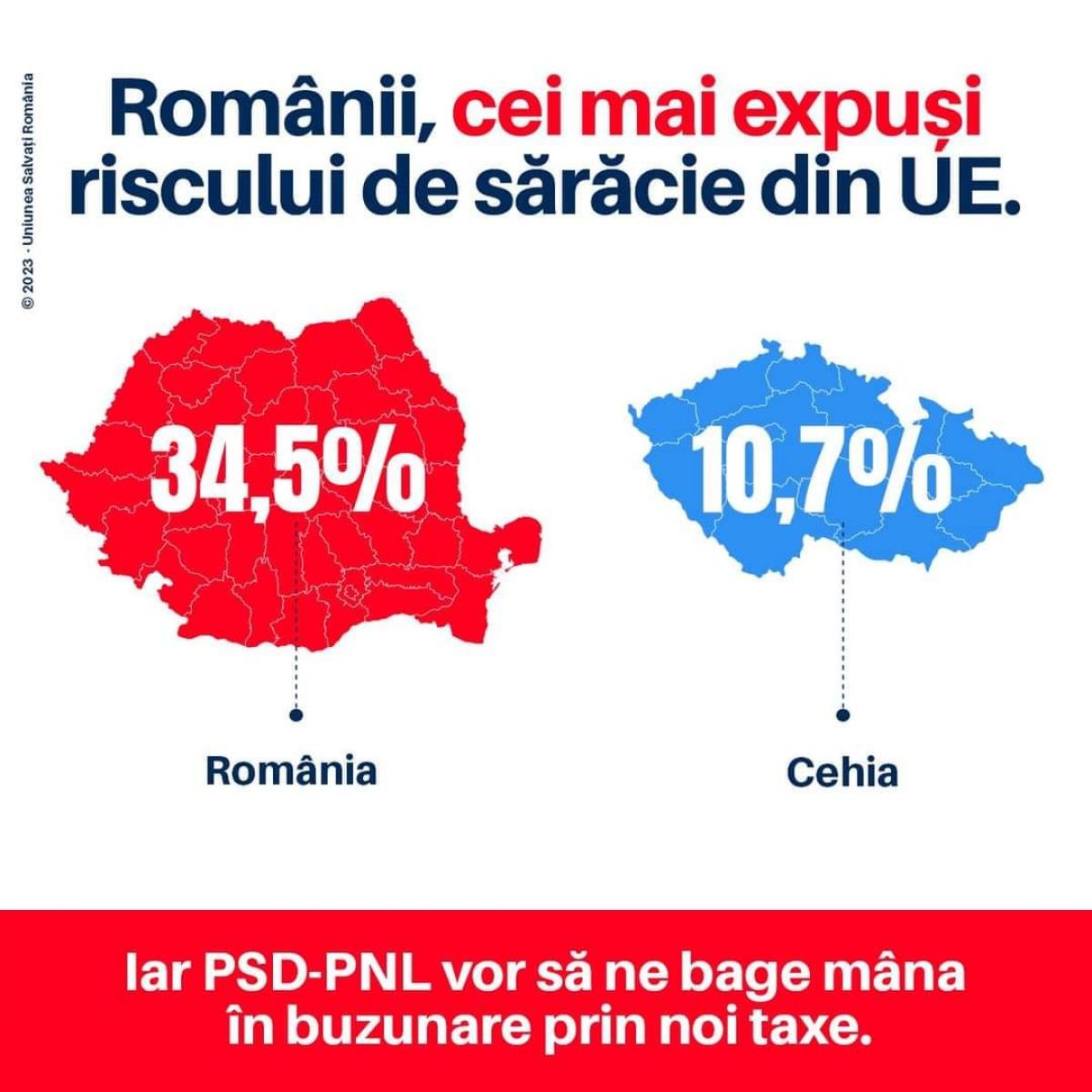 „Realitatea este că românii sunt cei mai expuși europeni în fața riscului de sărăcie. 34,5% din populația țării este aproape de pragul sărăciei, iar PSD și PNL vor să ne bage mâna în buzunare prin noi taxe. Inflația este mai mare decât cea din statisticile oficiale și nu se oprește. Decât să arunce iar prețurile în aer, coaliția de la guvernare ar trebui să desființeze instituțiile inutile, unele create special pentru anumite personaje politice. Și să taie pensiile speciale!”,