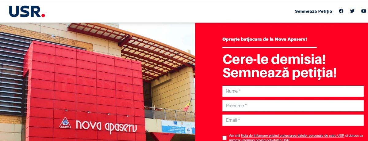 USR lansează astăzi campania de strângere de semnături pentru demiterea conducerii de la Nova Apaserv. Botoșănenii pot semna petiția electronică pe site-ul https://schimba-apa.ro/, dar și fizic, la cele două corturi ce vor fi amplasate în Municipiul Botoșani: la Piața Mare și pe Pietonalul Unirii.