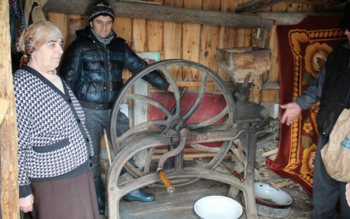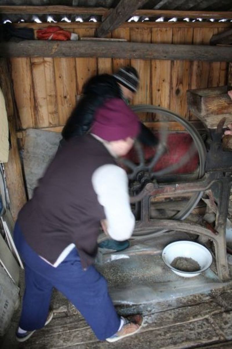 În timp ce tinerii pun în mişcare moara, Gheorghe Puşchiu, proprietarul acesteia toarnă cu atenţie seminţele. Tanti Elena are peste 80 de ani şi spune că de când se ştie, a fost mereu coadă la moară.