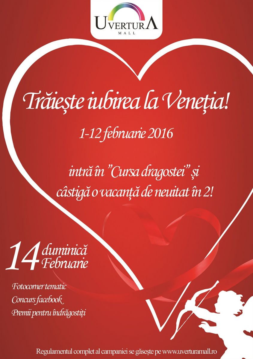 „Trăiește-ți iubirea la Veneția”, în perioada 1-12 februarie, toți cei care fac cumpărături de minim 100 lei de la magazinele preferate, se pot înscrie în „Cursa Dragostei”, care va avea loc duminică, 14 februarie, la etajul 4, începând cu ora 13:30. Norocoșii vor arăta cât de bine își cunosc partenerul și cât de tare dragostea arde…calorii, toate acestea pentru un sejur în doi în unul dintre cele mai romantice orașe, Veneția.