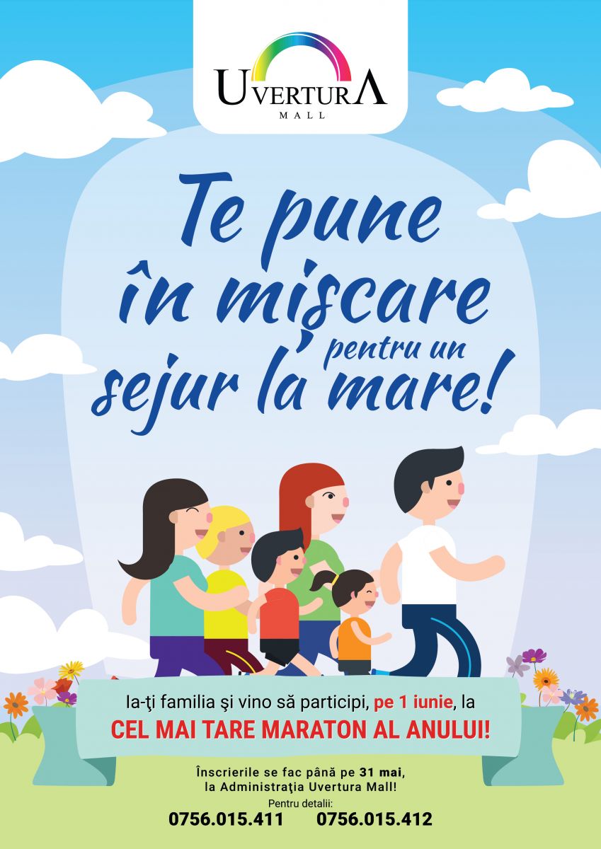 Părintele reprezintă principalul contact pe care un copil îl are cu mediul înconjurător și este factorul care dă forma personalității și universului pe care acesta și-l va crea. De aceea, este foarte important ca părinții să le dedice cât mai mult timp celor mici, să se joace împreună cu ei și să se implice în toate activitățile desfășurate de aceștia. Pentru a le oferi părinților și copiilor ocazia de a petrece timp valoros împreună și pentru a-i aduce pe adulți încă o dată pe tărâmul copilăriei, Uvertura Mall organizează cea mai interesantă competiție sportivă de tip maraton. Cei mici vor alerga împreună cu părinții pe un traseu din parcarea centrului comercial, iar echipa câștigătoare este trimisă de Uvertura Mall pe litoralul românesc, într-un sejur de șapte zile. Actiunea se va desfășura pe data de 1 iunie, începând cu ora 17:00.