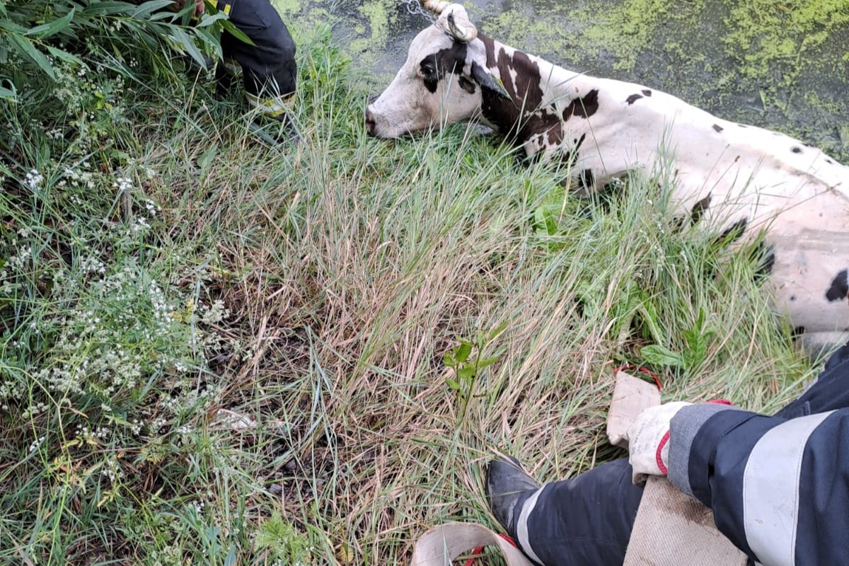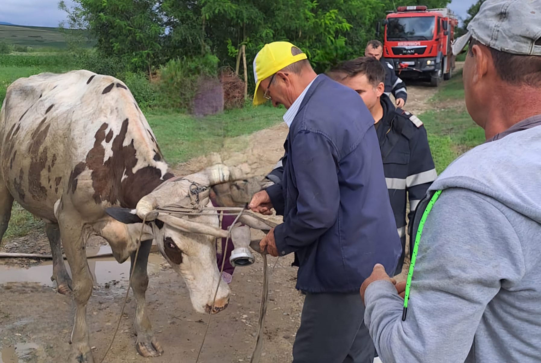 Aceștia au legat bovina cu chingi specifice pentru salvare și, cu ajutorul unui buldoexcavator, au reușit să o aducă pe mal. Animalul nu a fost rănit.