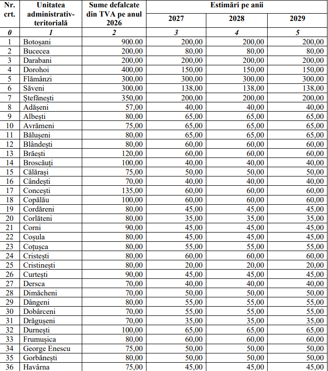 Cele mai mari sume sunt propuse astfel: Botoșani – 900.000 de lei, Dorohoi – 400.000 de lei, Ștefănești – 350.000 de lei, câte 300.000 de lei pentru Flămânzi și Săveni și câte 200.000 de lei către Lunca și Hudești.