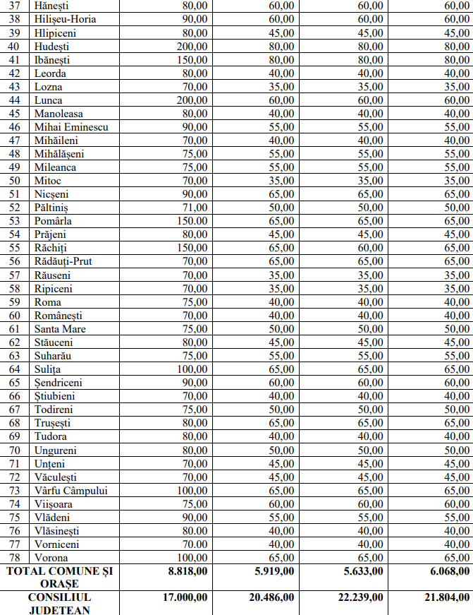 Conform propunerii Consiliului Județean, cea mai mică sumă ar reveni comunei Adășeni, adică 57.000 de lei.