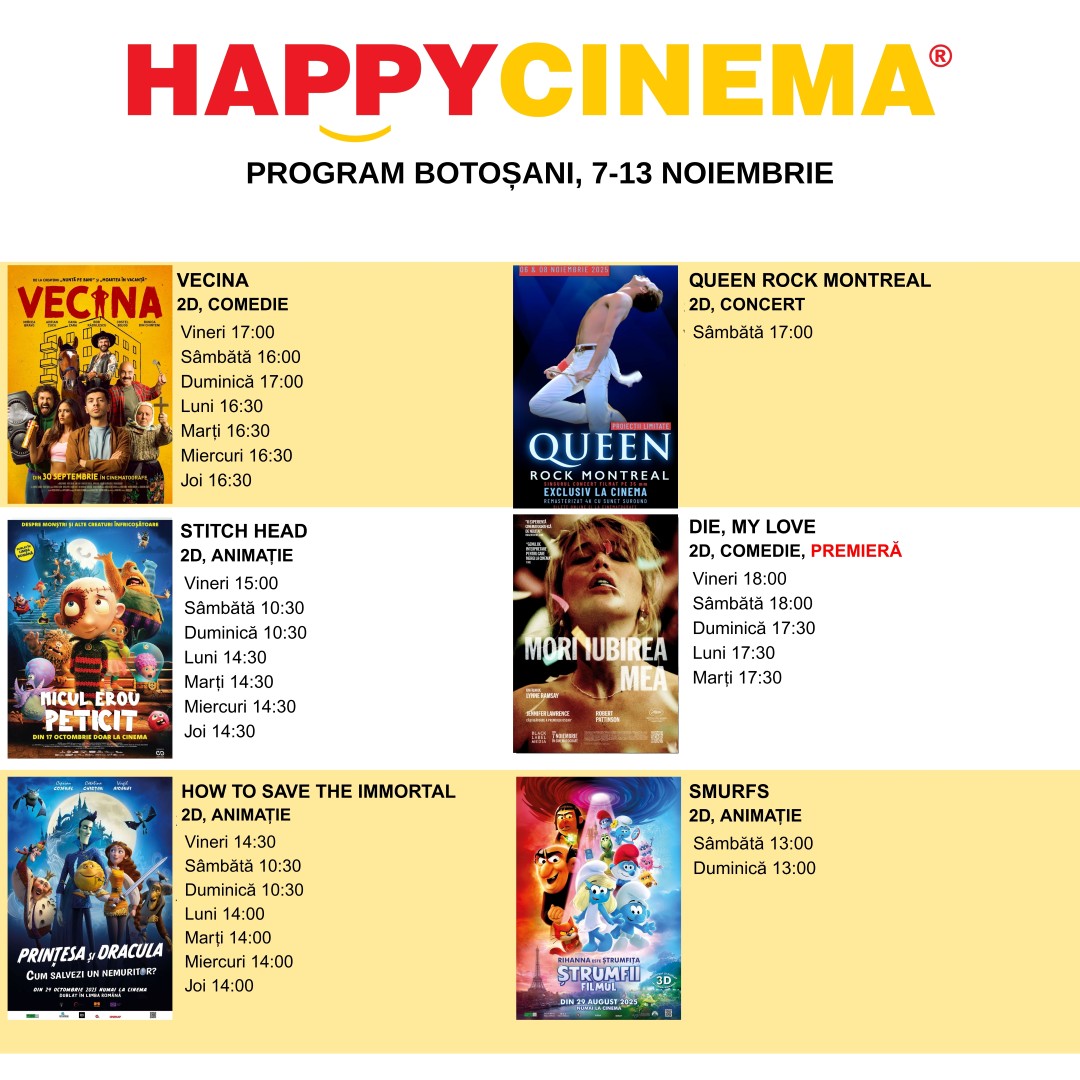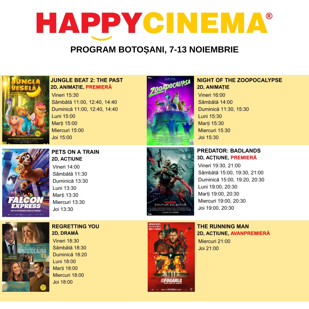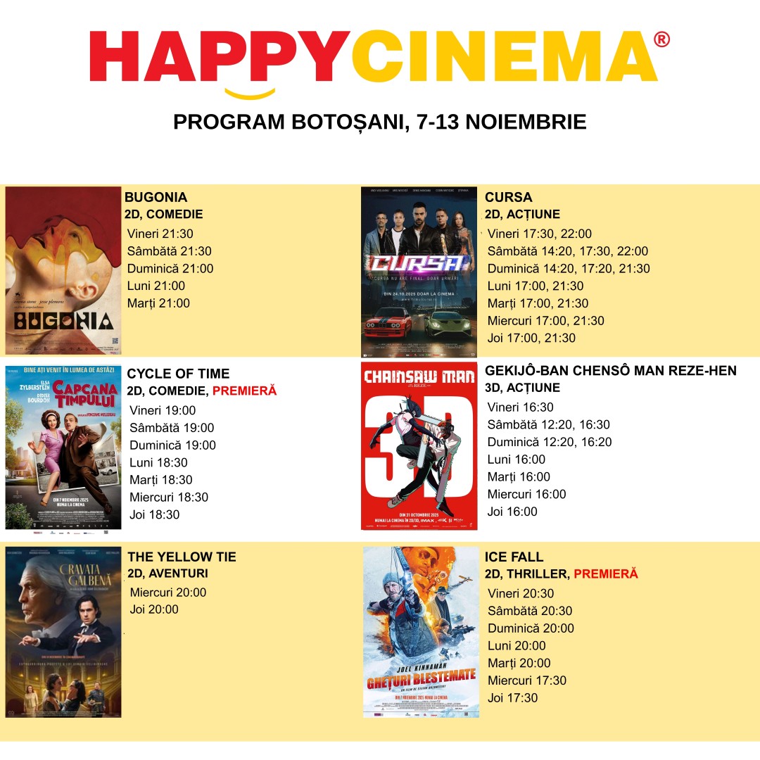 Happy Cinema Botoșani a transmis programul săptămâni pentru perioada 7 – 13 noiembrie 2025.