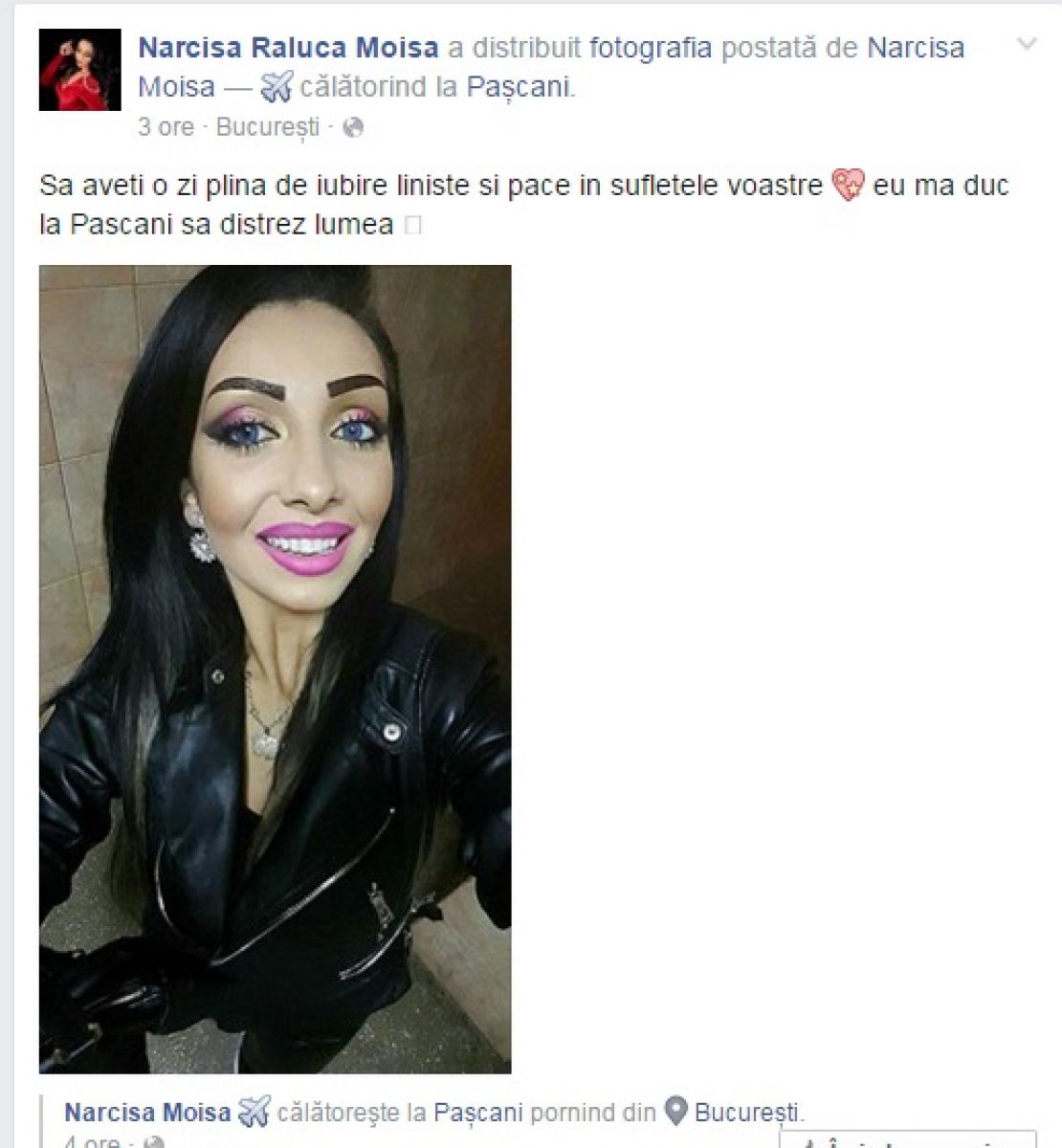 ”Să aveți o zi plină de iubire liniște și pace în sufletele voastre. Eu mă duc la Pașcani, să distrez lumea”- Narcisa Moisa cântăreață.