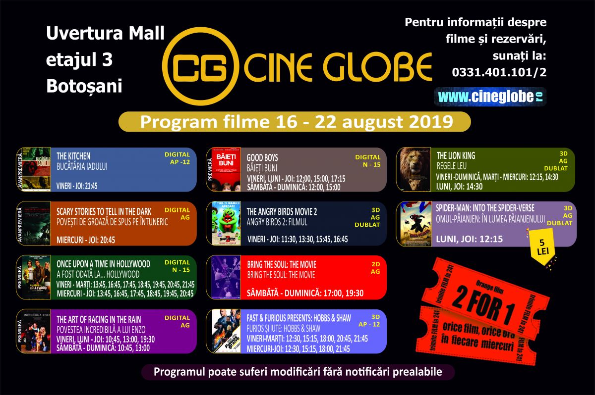 De la Good boys (Băieți buni) la Once upon a time in Hollywood (A fost odată la... Hollywood), Cine Globe aduce pe marele ecran filme dintre cele mai diverse, pentru toate vârstele. Programul este valabil, la Botoșani, pentru intervalul 16-22 august.